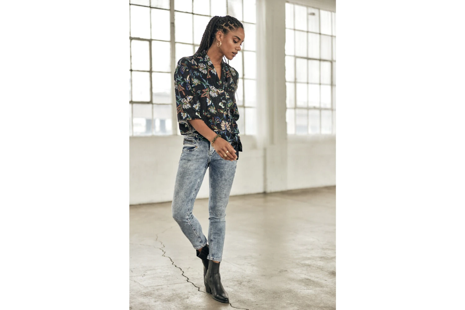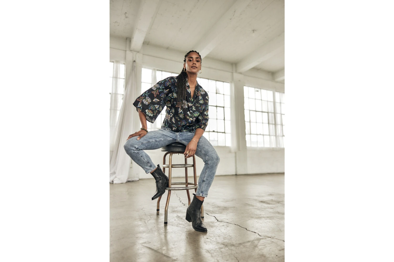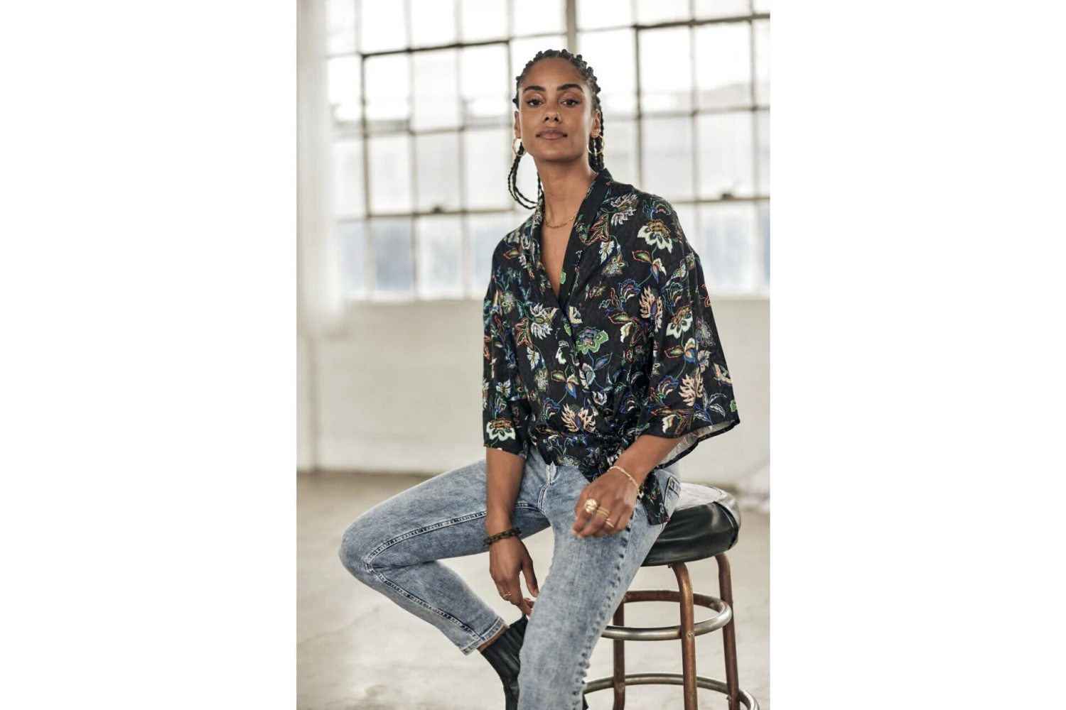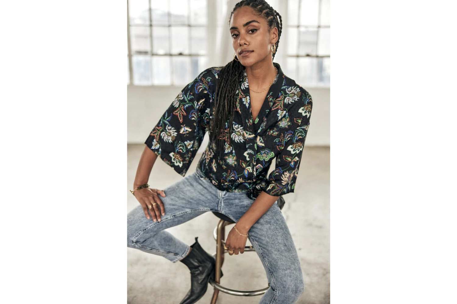 Anne-Sophie mesure 173 cm et porte une taille S.