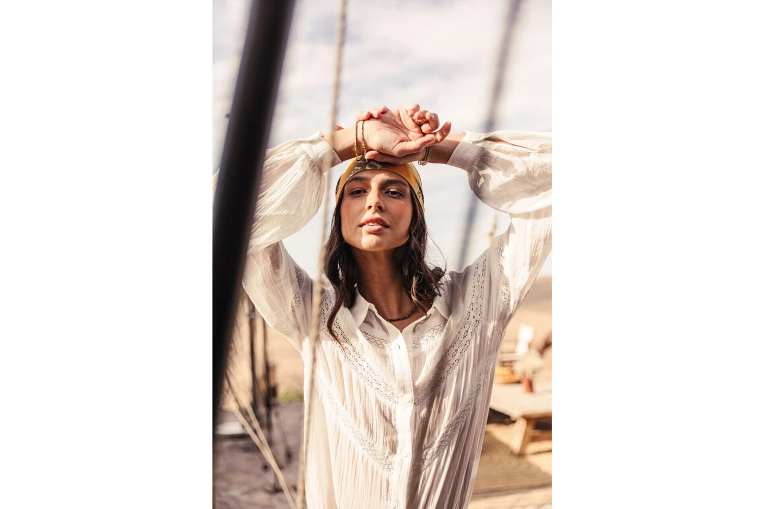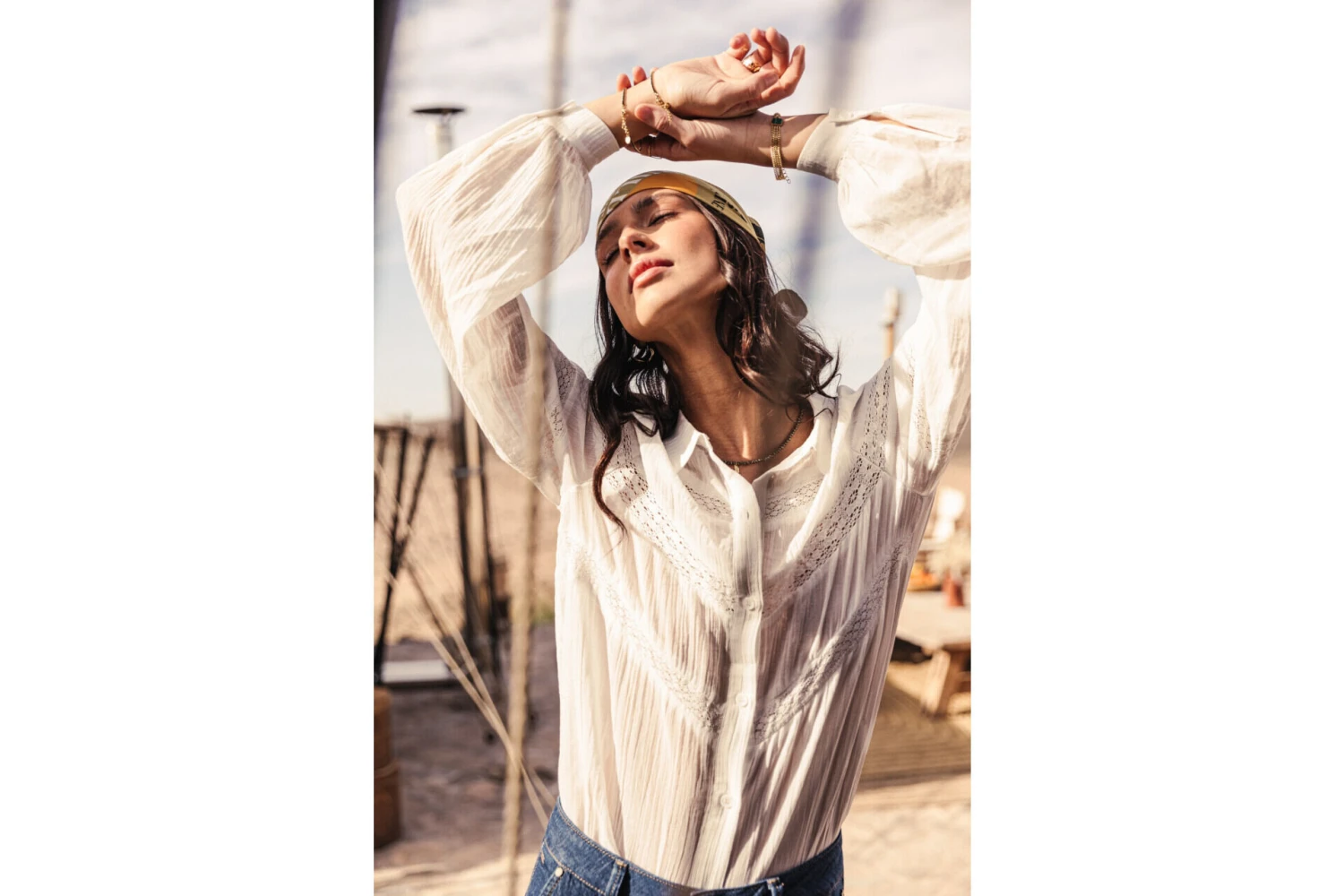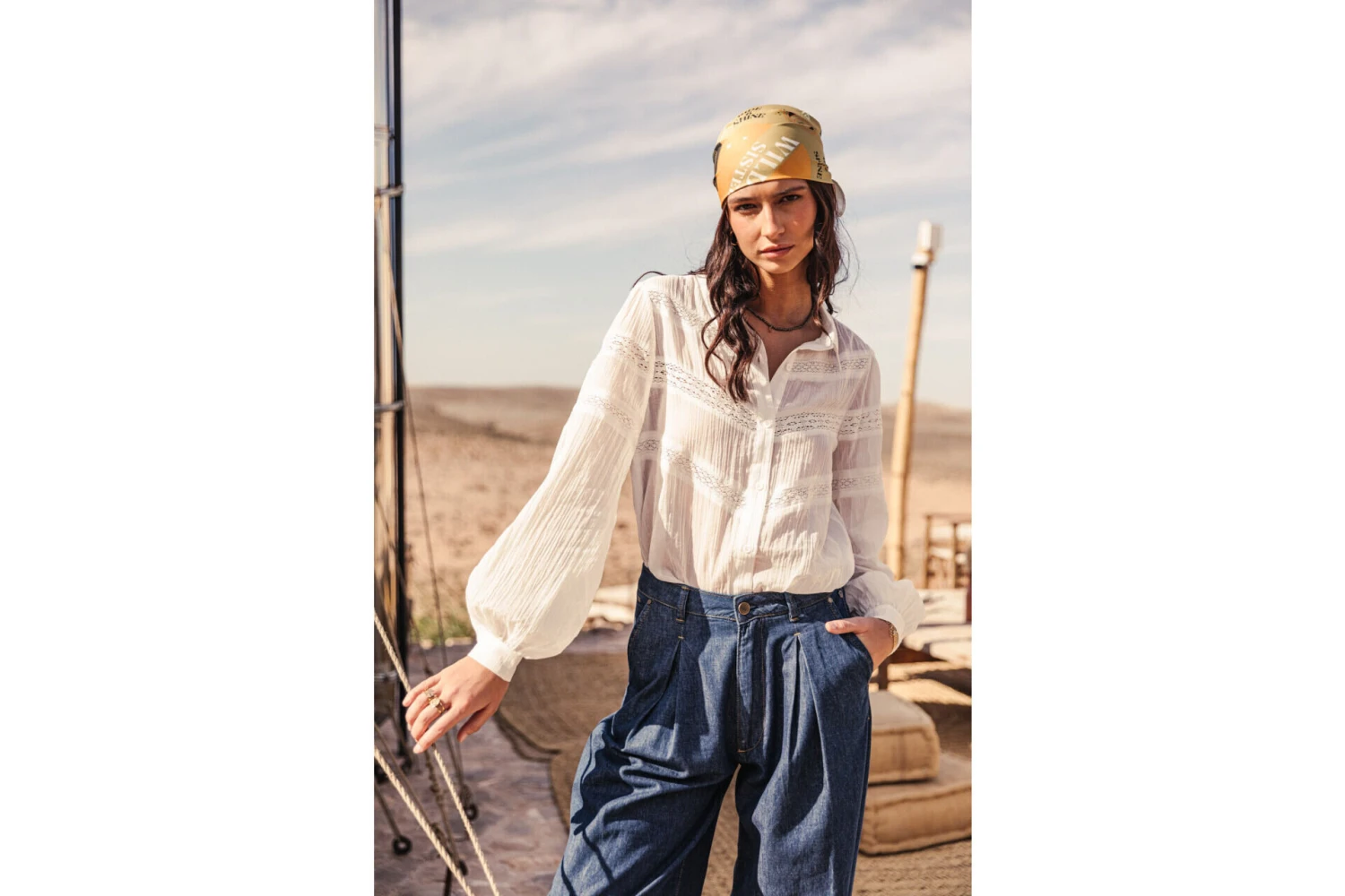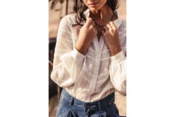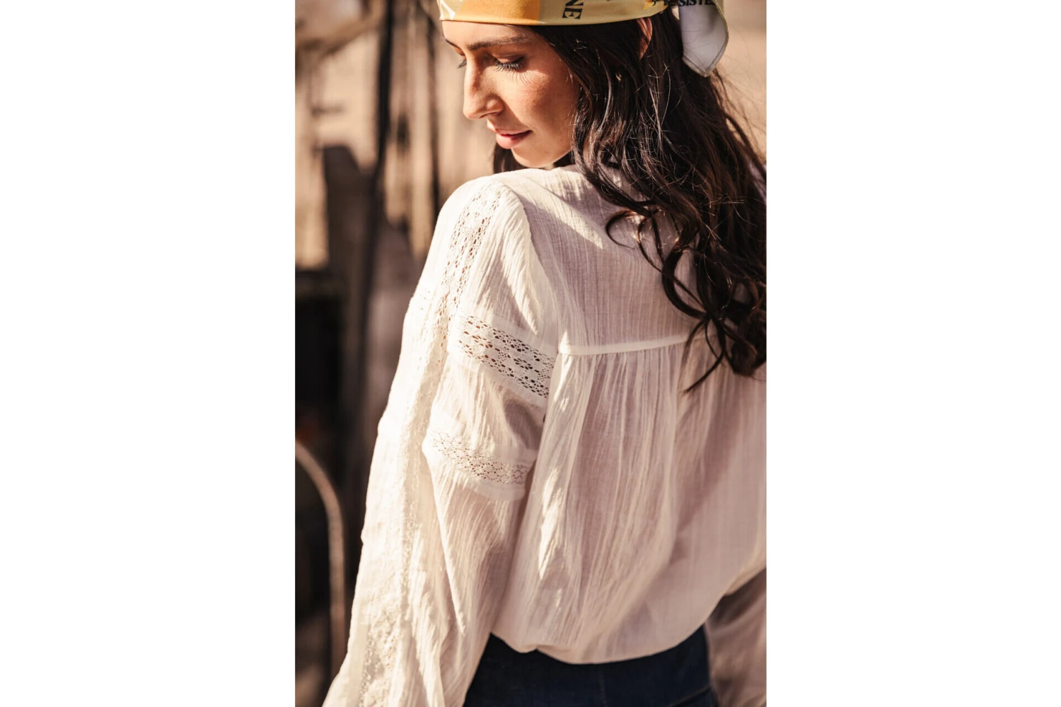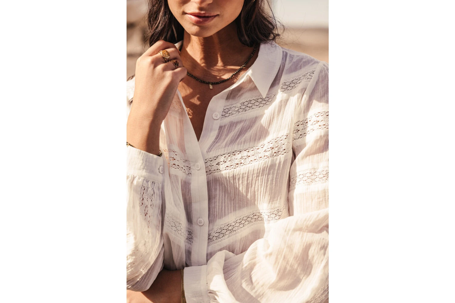 • Galons de dentelles en forme de V sur le devant et le long des manches