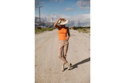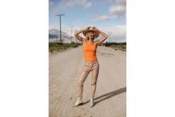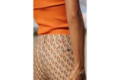 • Matière twill stretch, imprimé géométrique inspiration années 70, dans les tons amande, orange et bleu marine