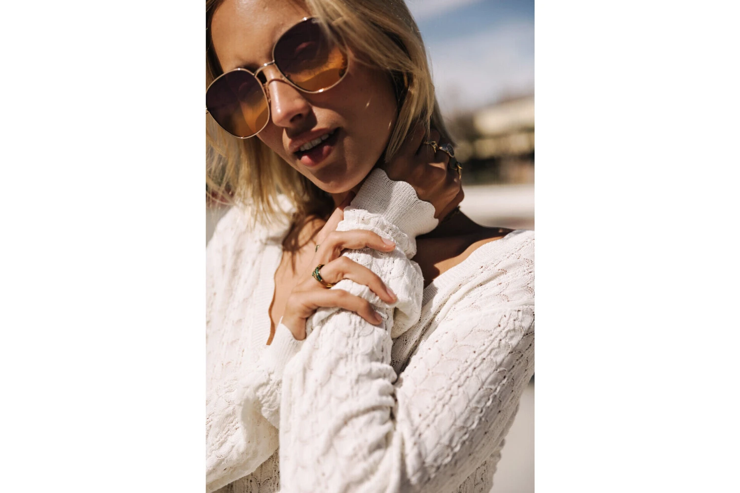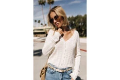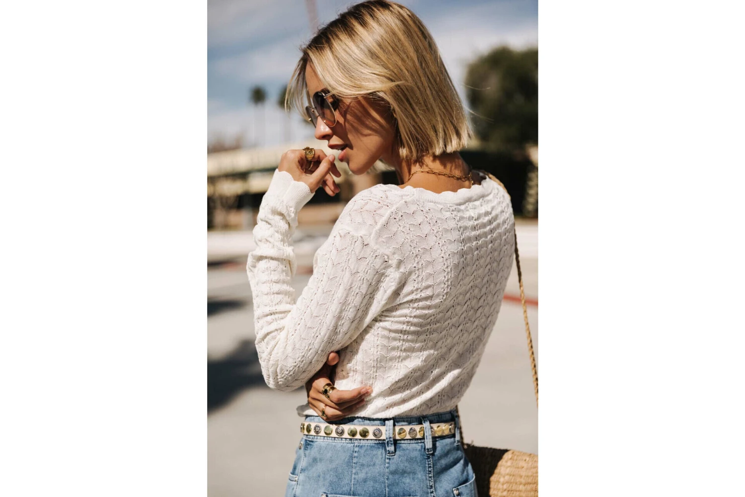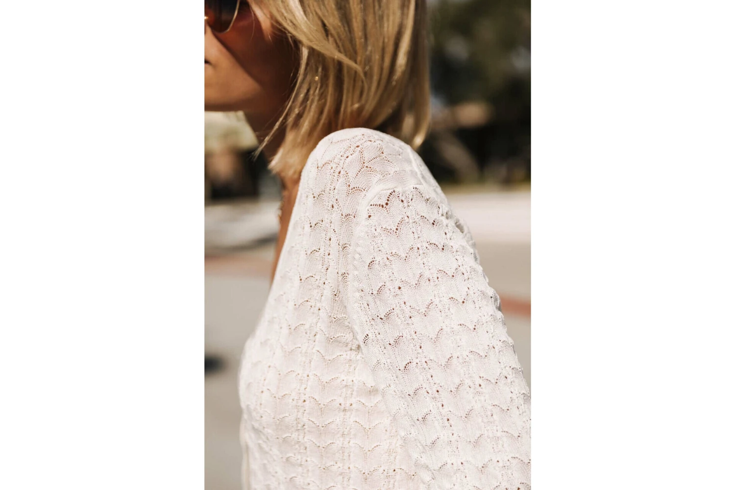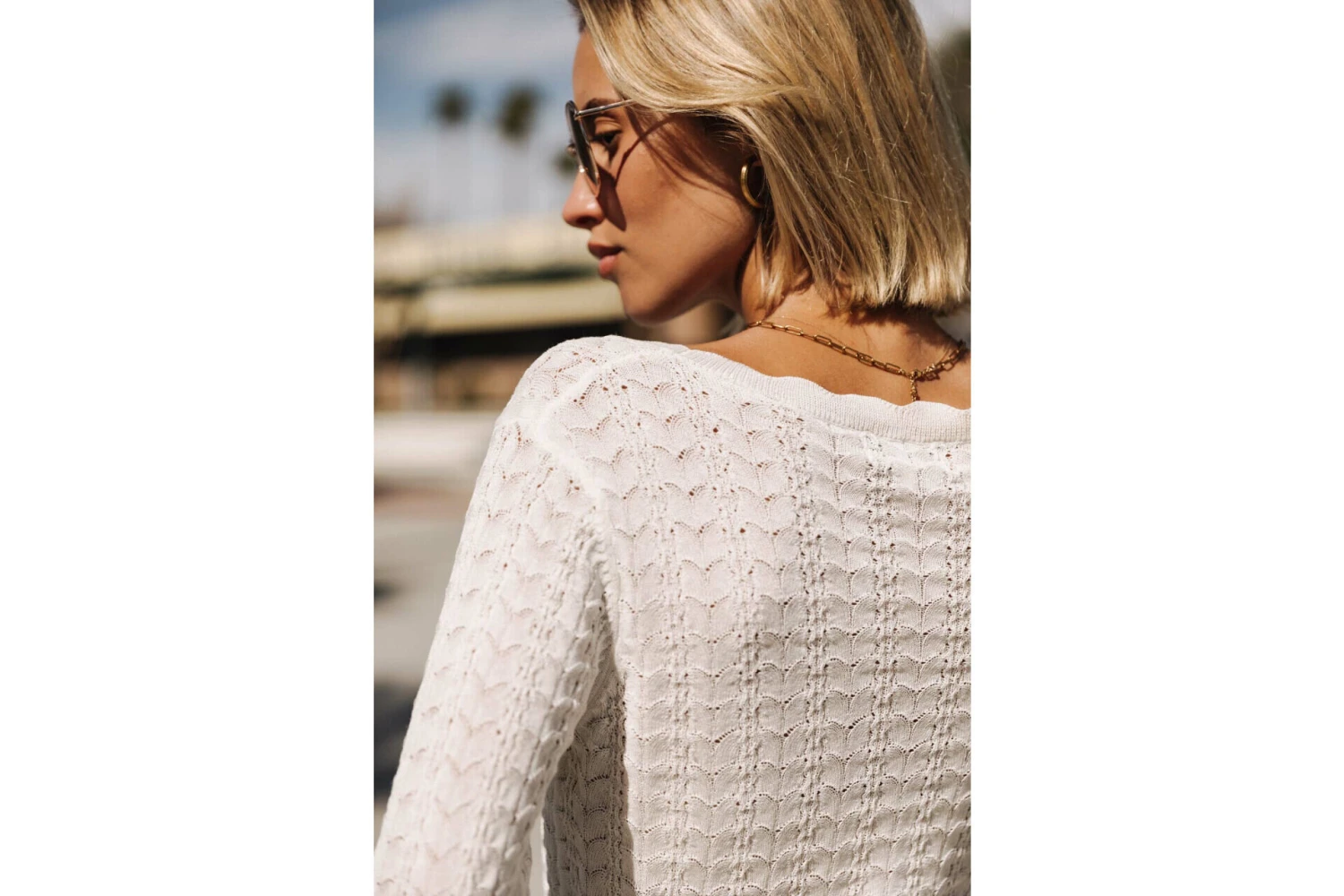 • DĂ©tail de rib fantaisie sur l’encolure, le milieu devant et le bas des manches