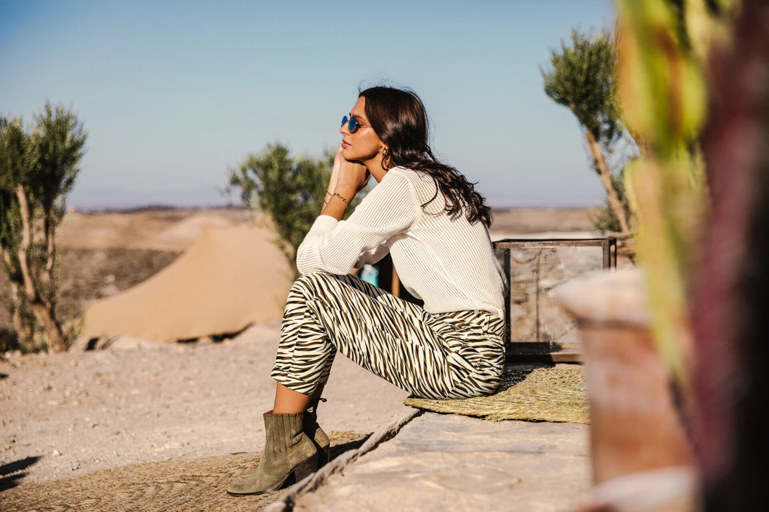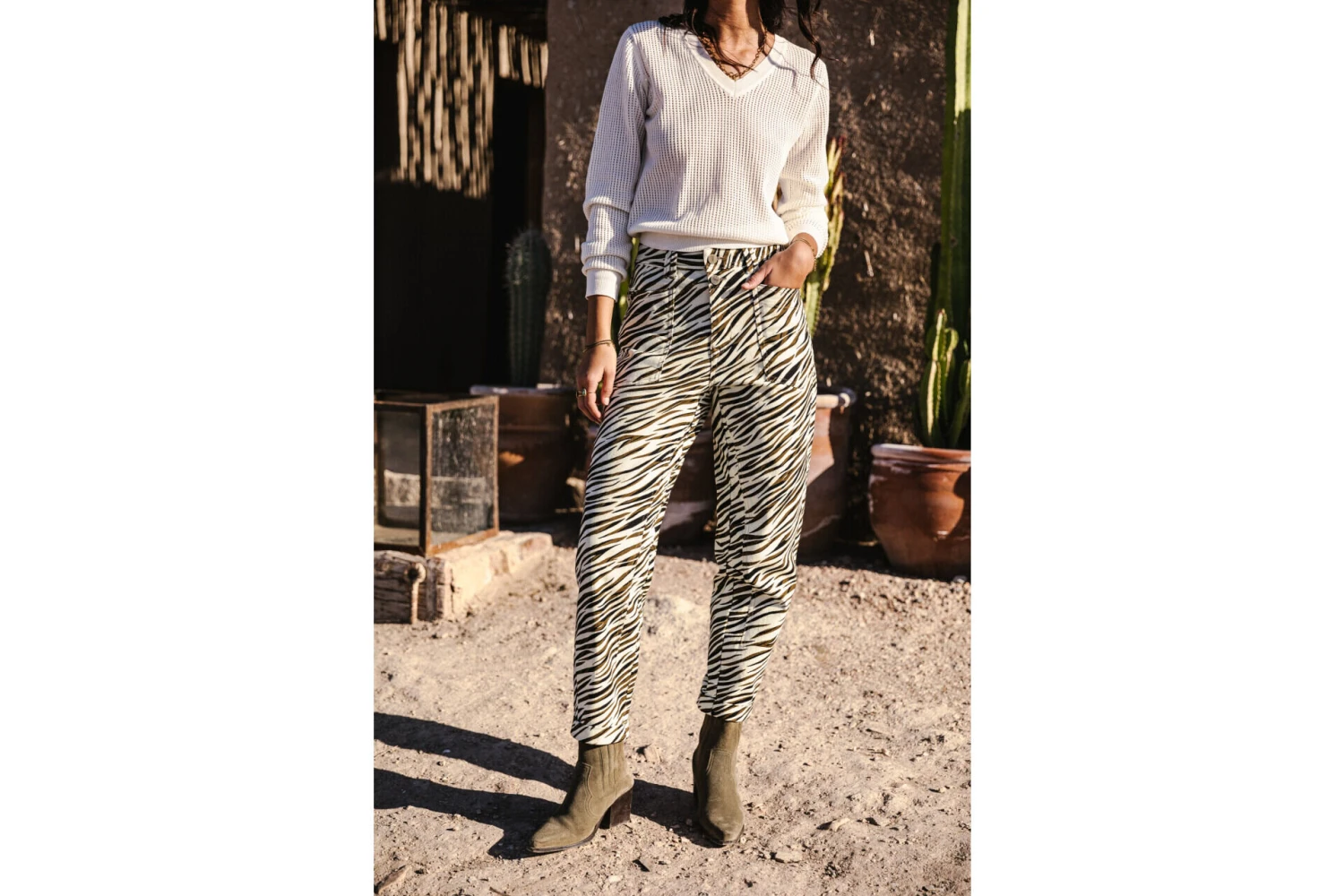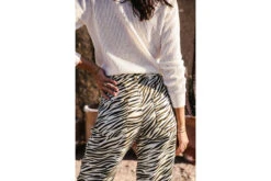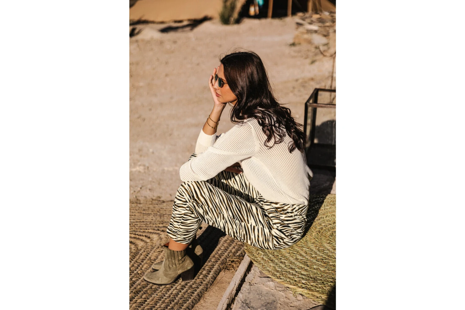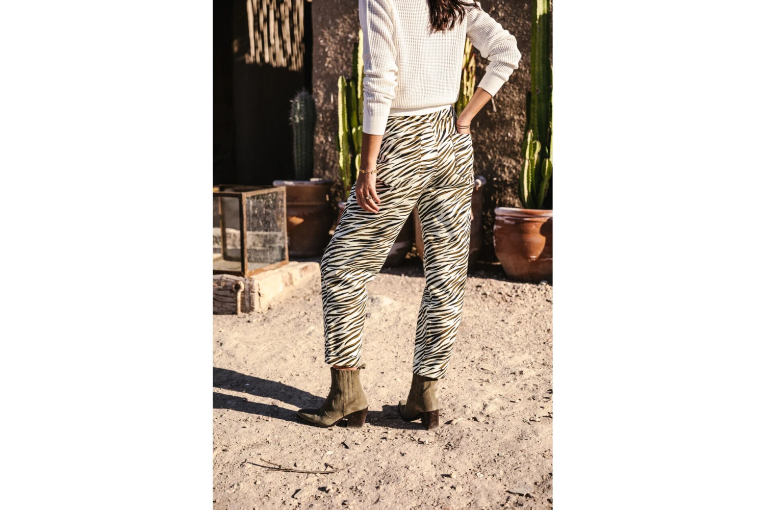 • Matière twill très légèrement stretch, imprimé zèbre khaki et blanc cassé