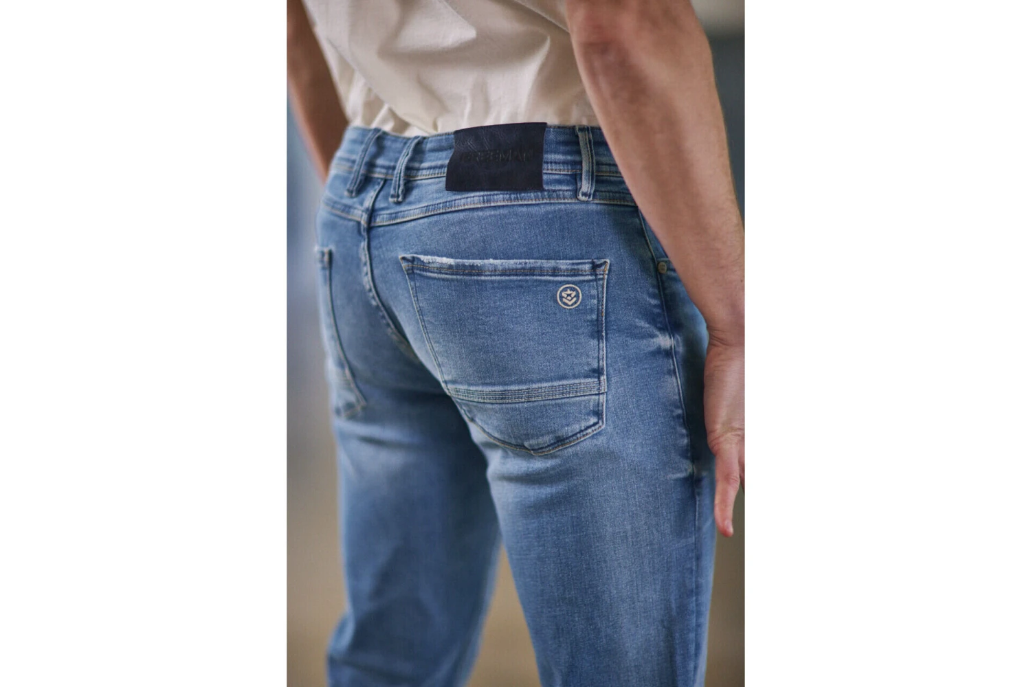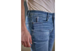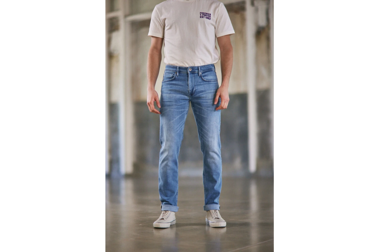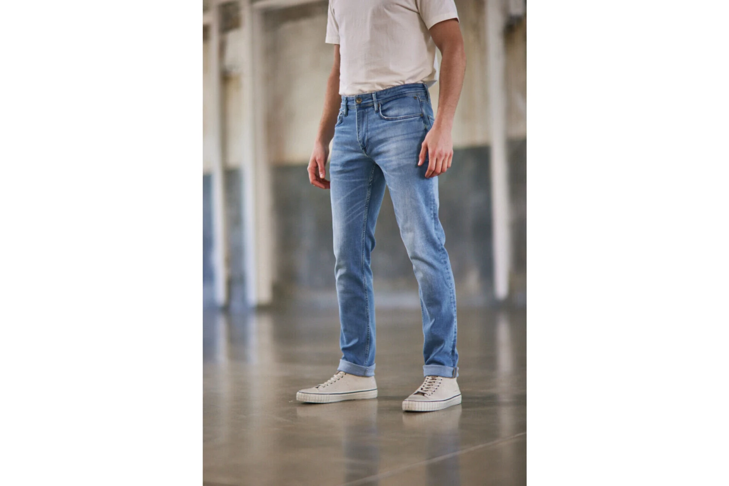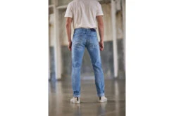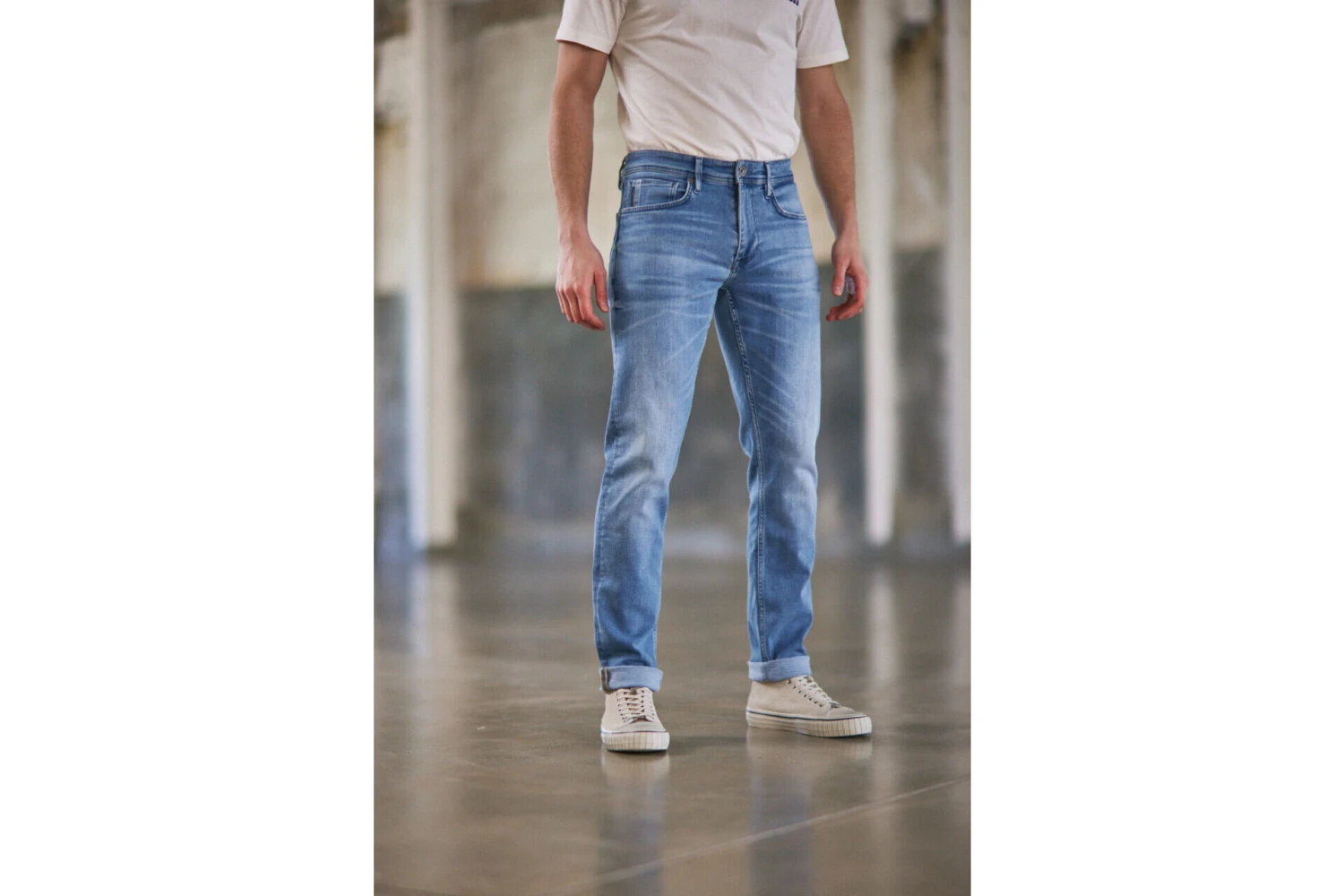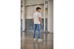 Délavage bleu clair, usé, esprit authentique avec quelques déchirures