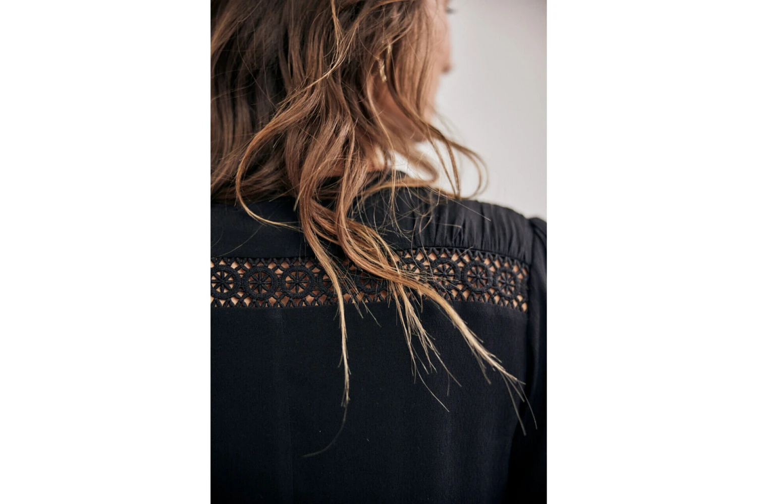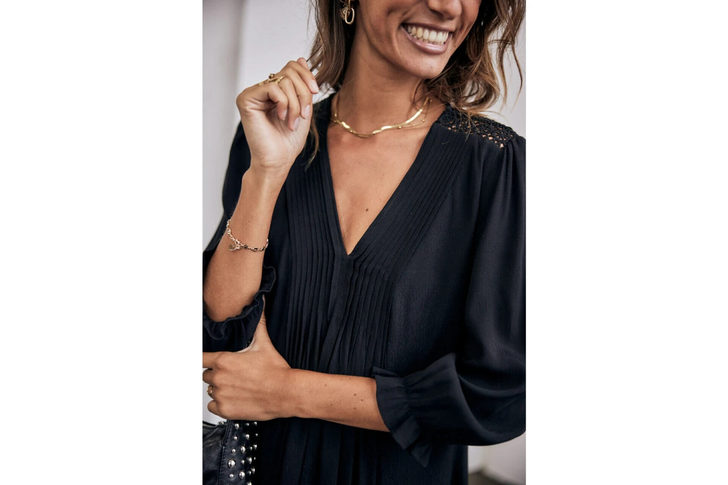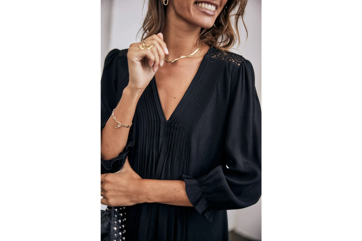 ⹠Encolure en « V » avec détails multiplis