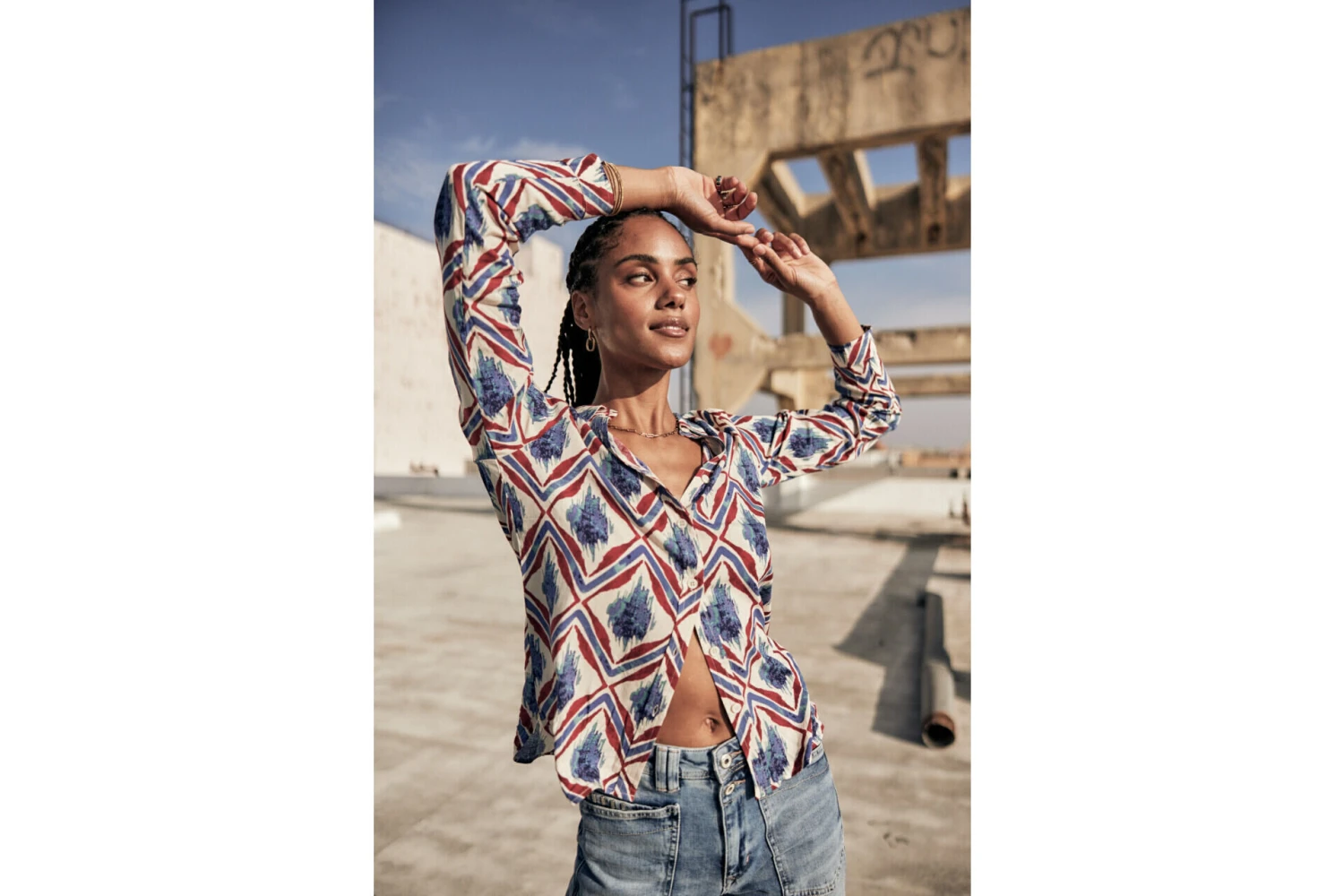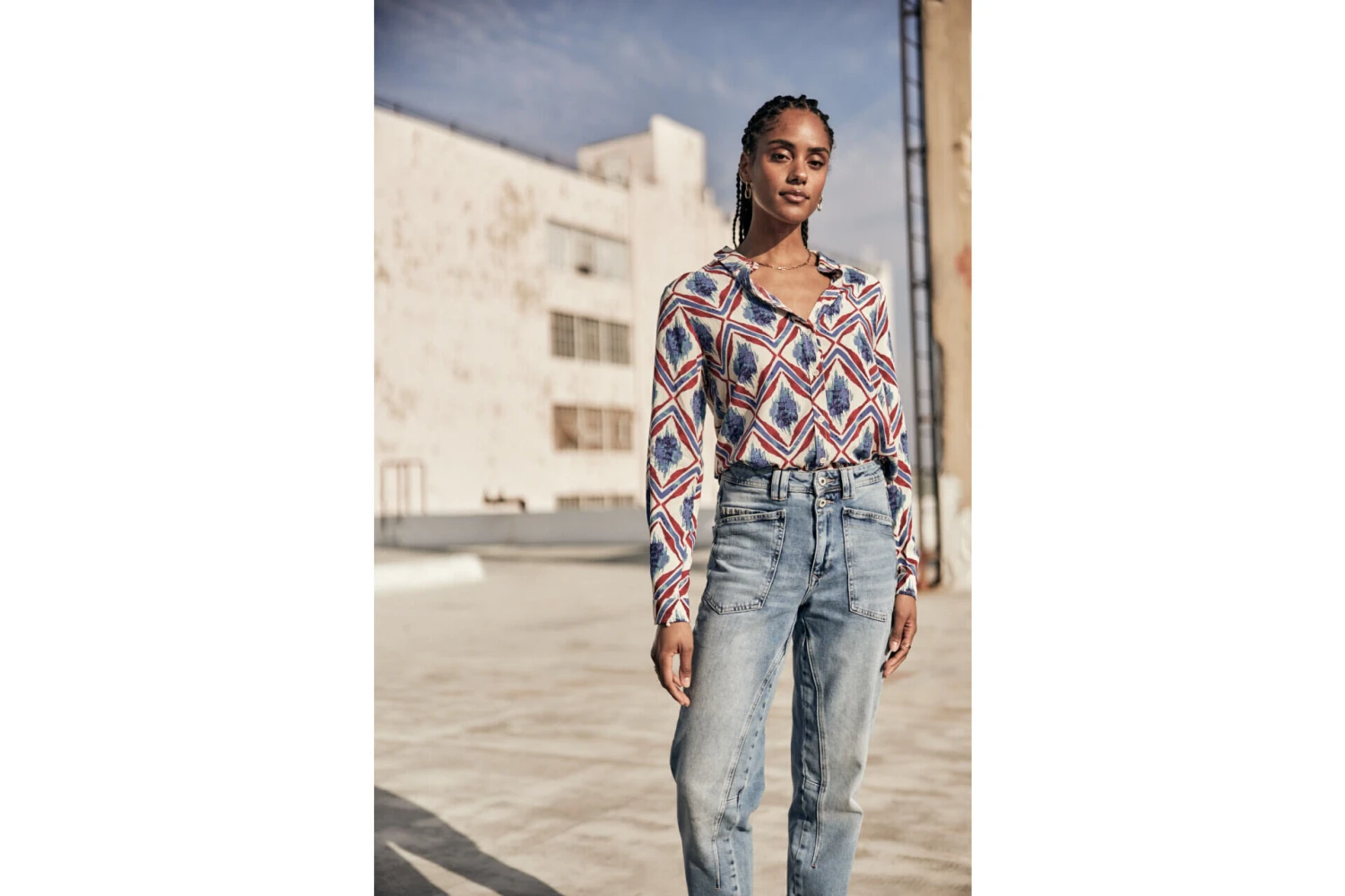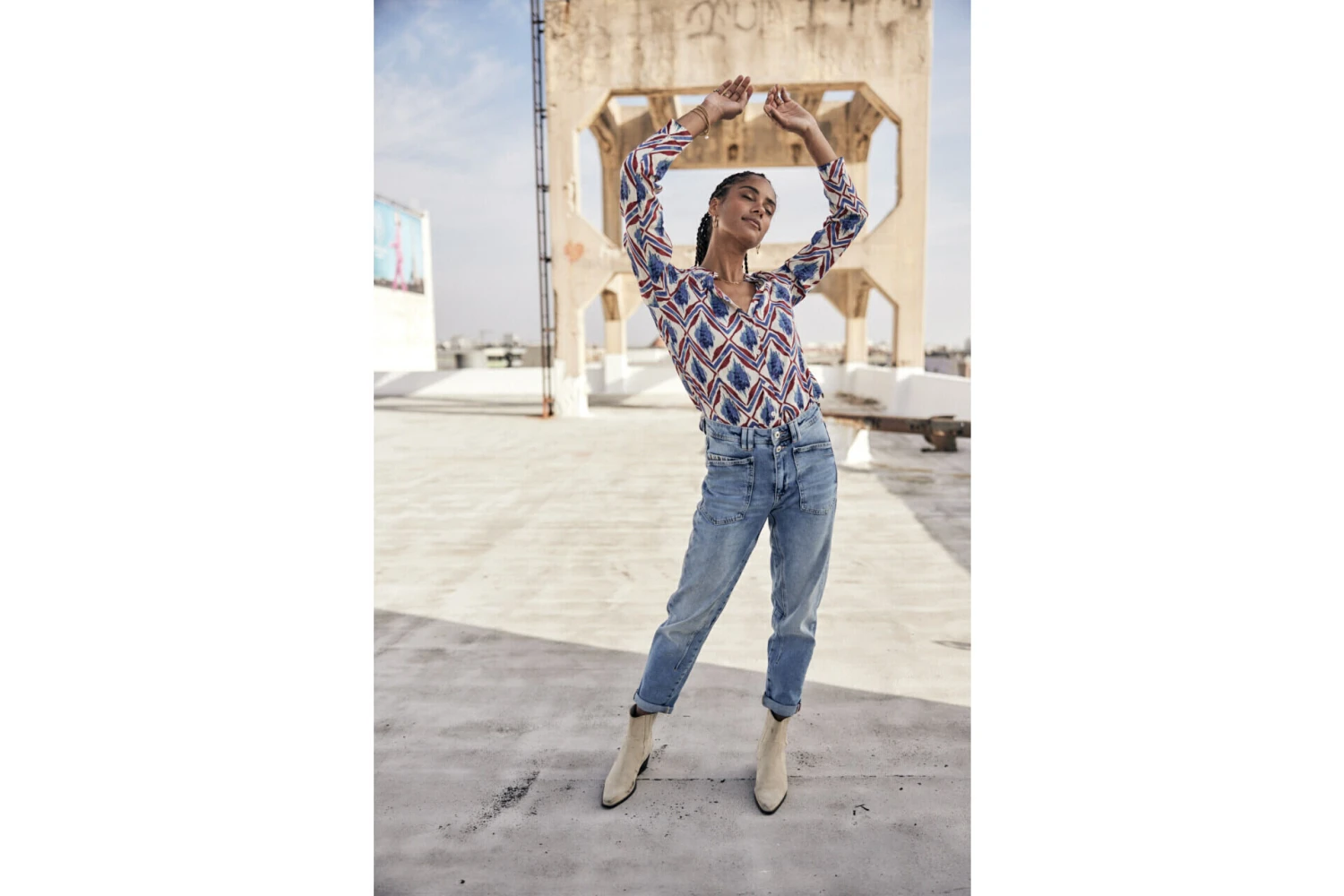 Anne-Sophie mesure 173 cm et porte une taille S.