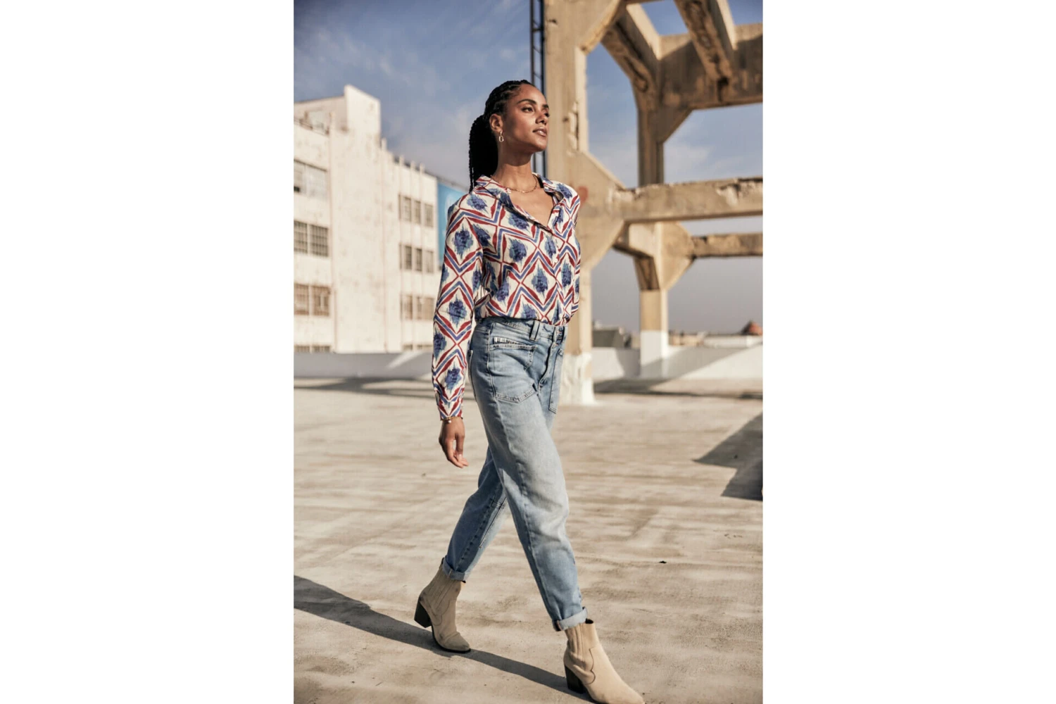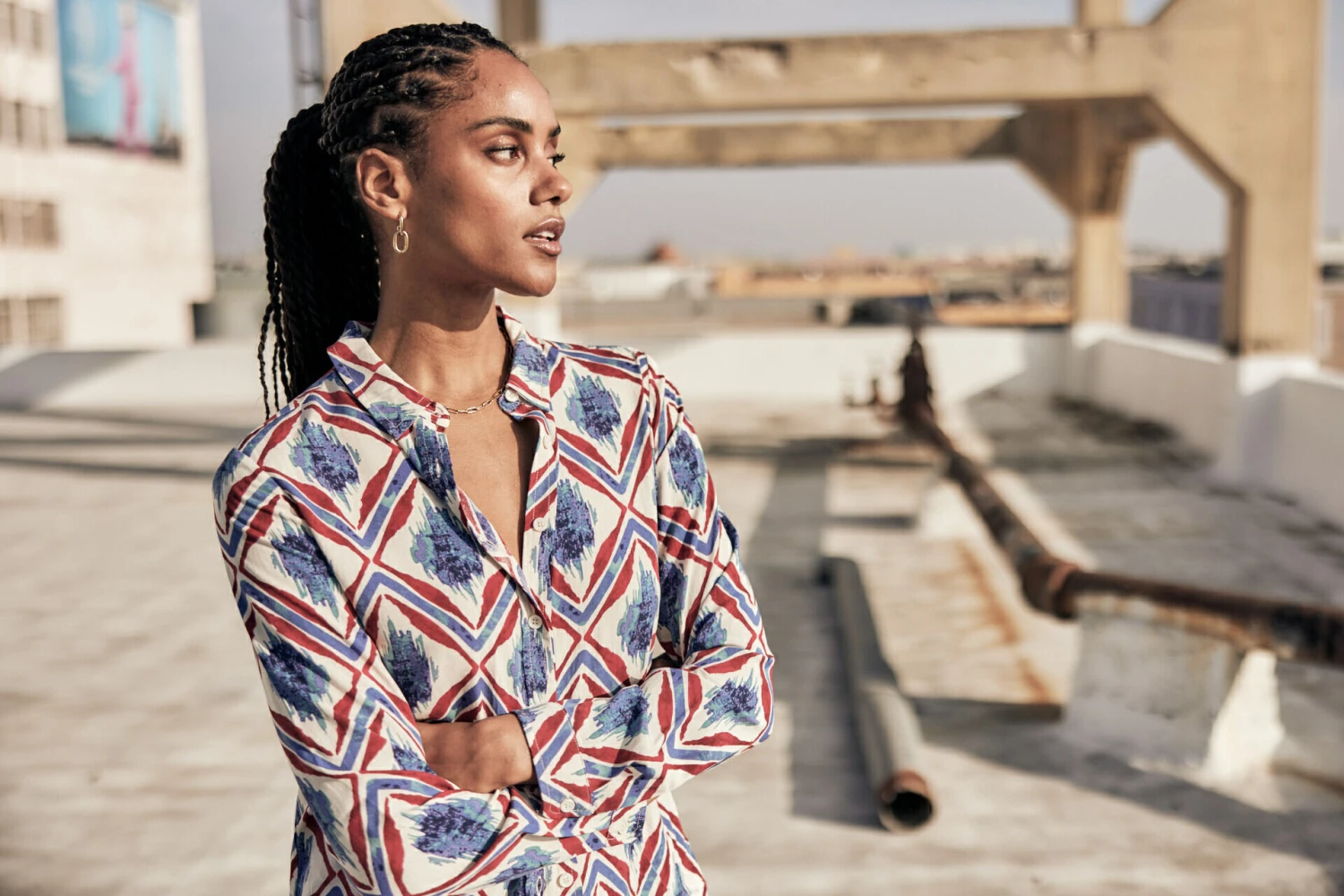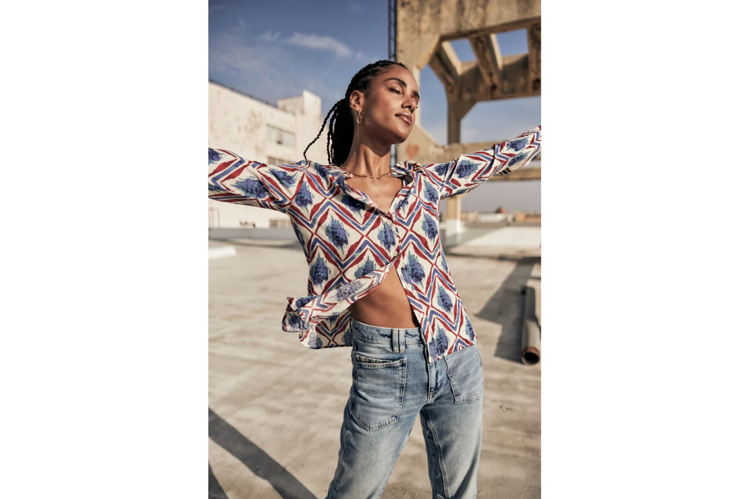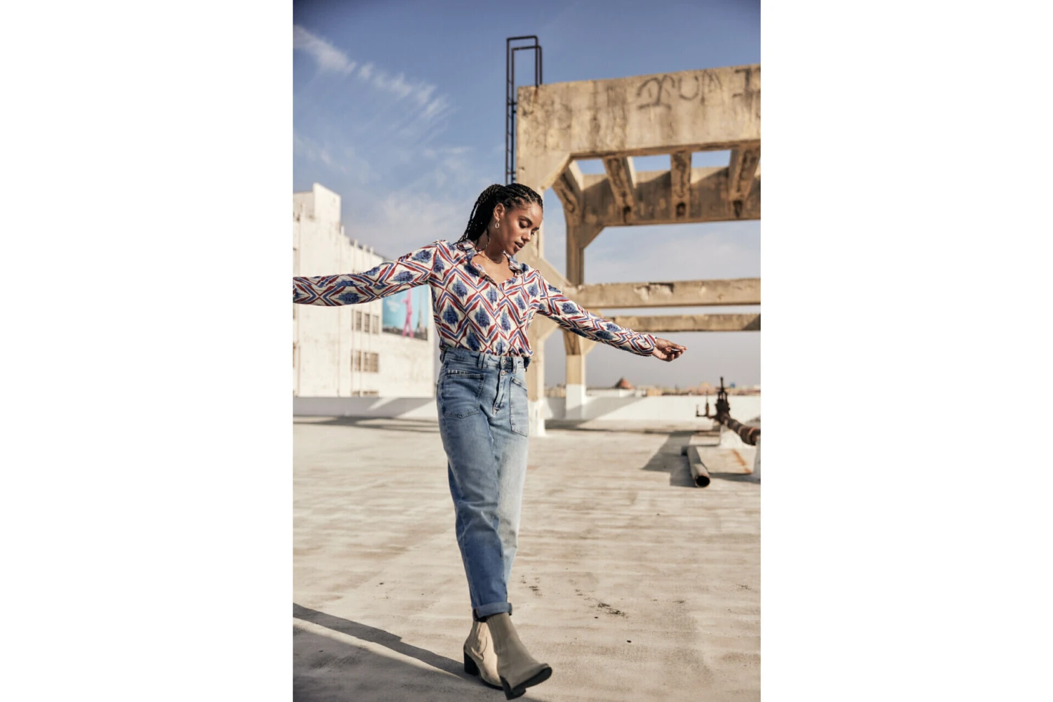 Anne-Sophie mesure 173 cm et porte une taille S.