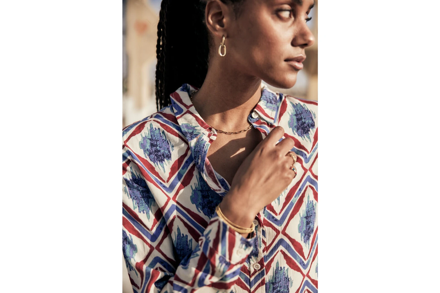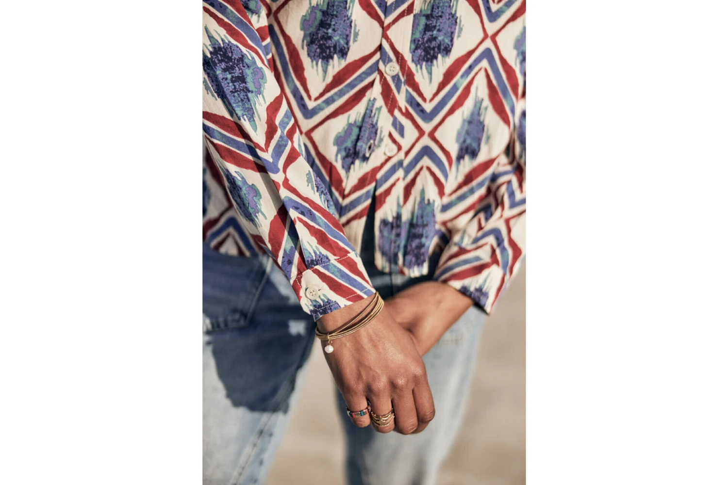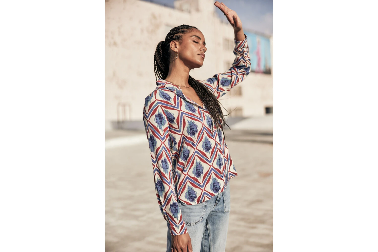 • Imprimé géométrique à losanges aquarellés de couleur bleu et rouge sur fond écru