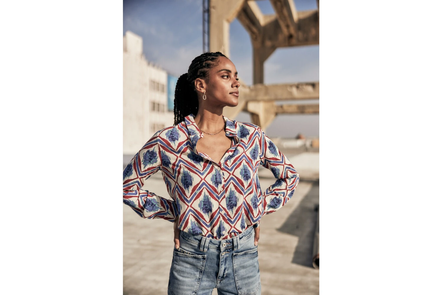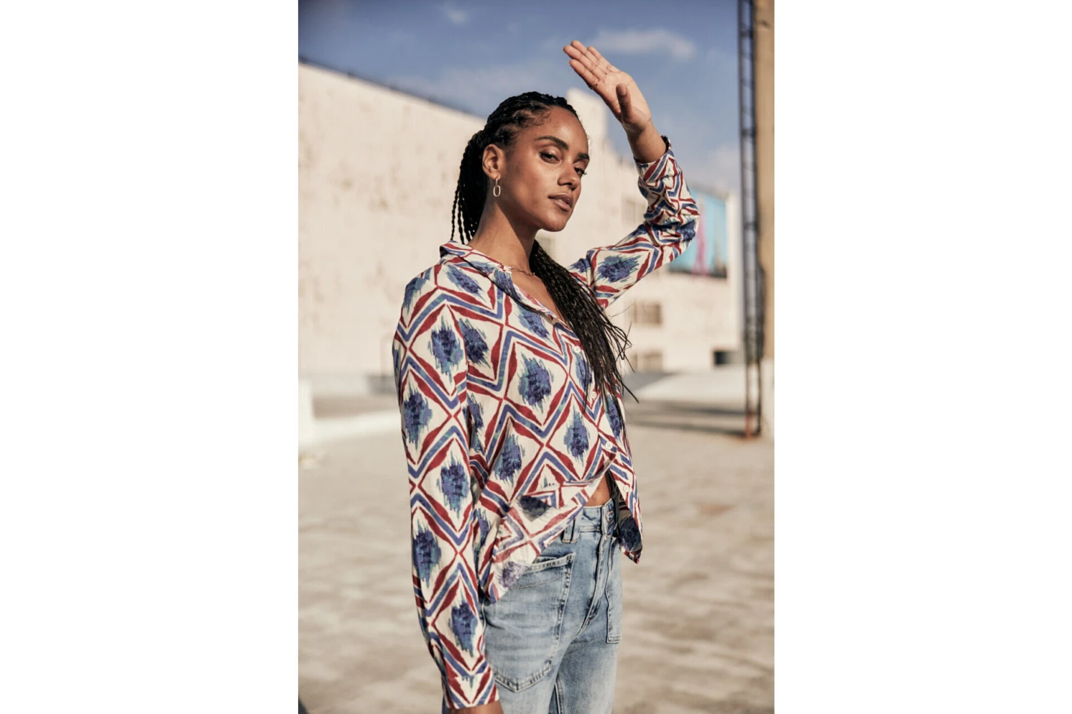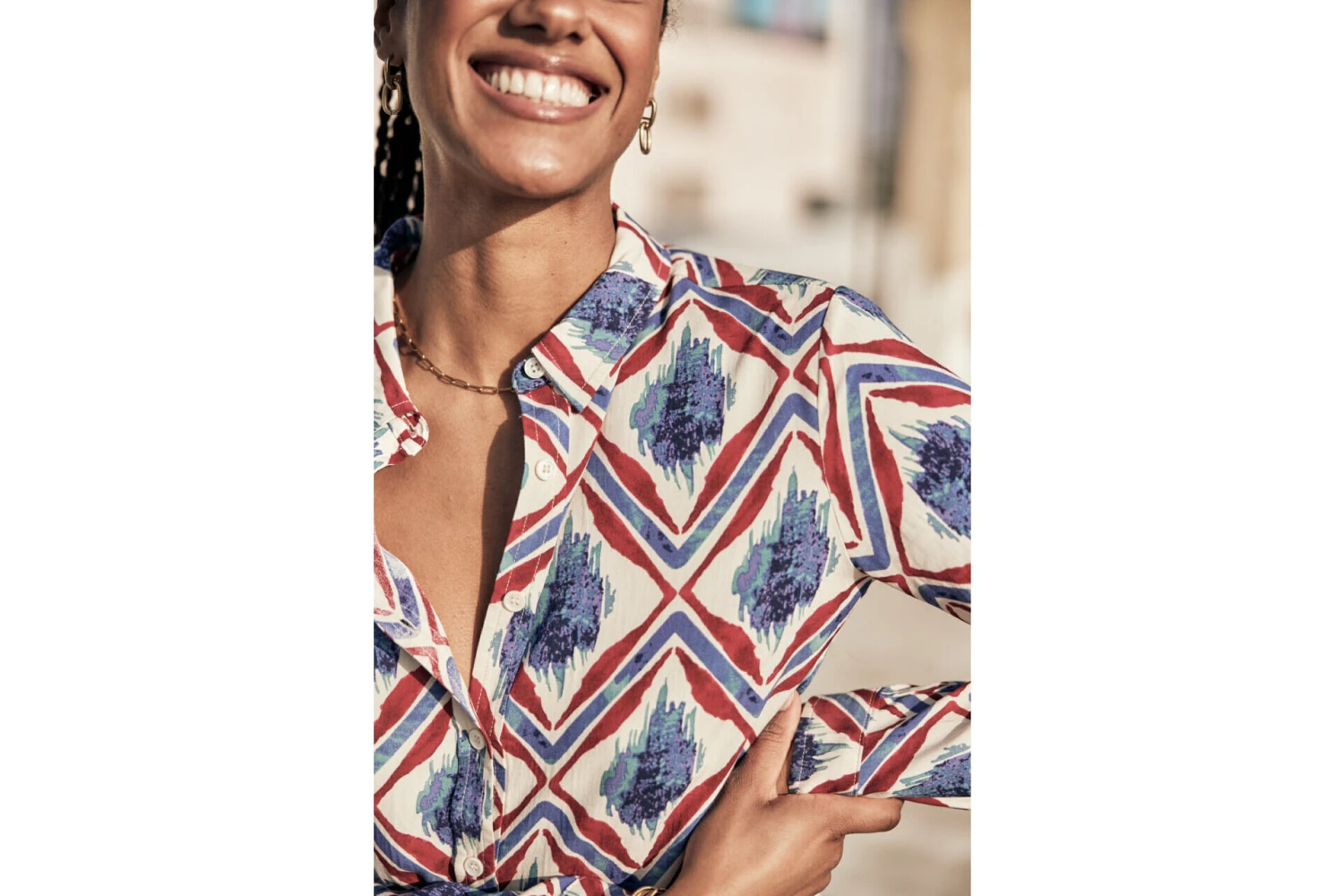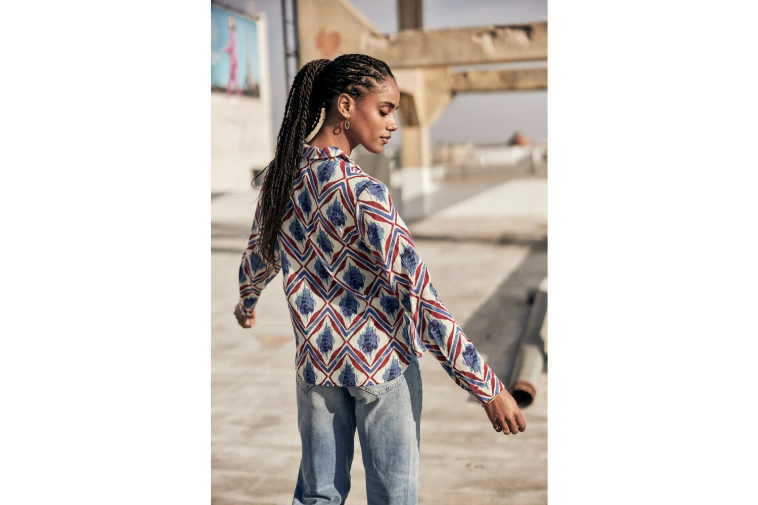 • Imprimé géométrique à losanges aquarellés de couleur bleu et rouge sur fond écru