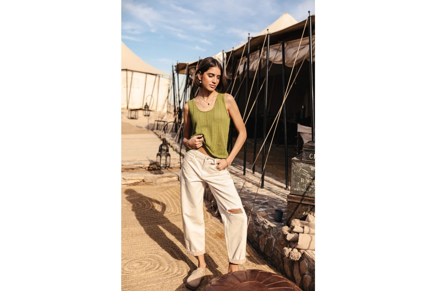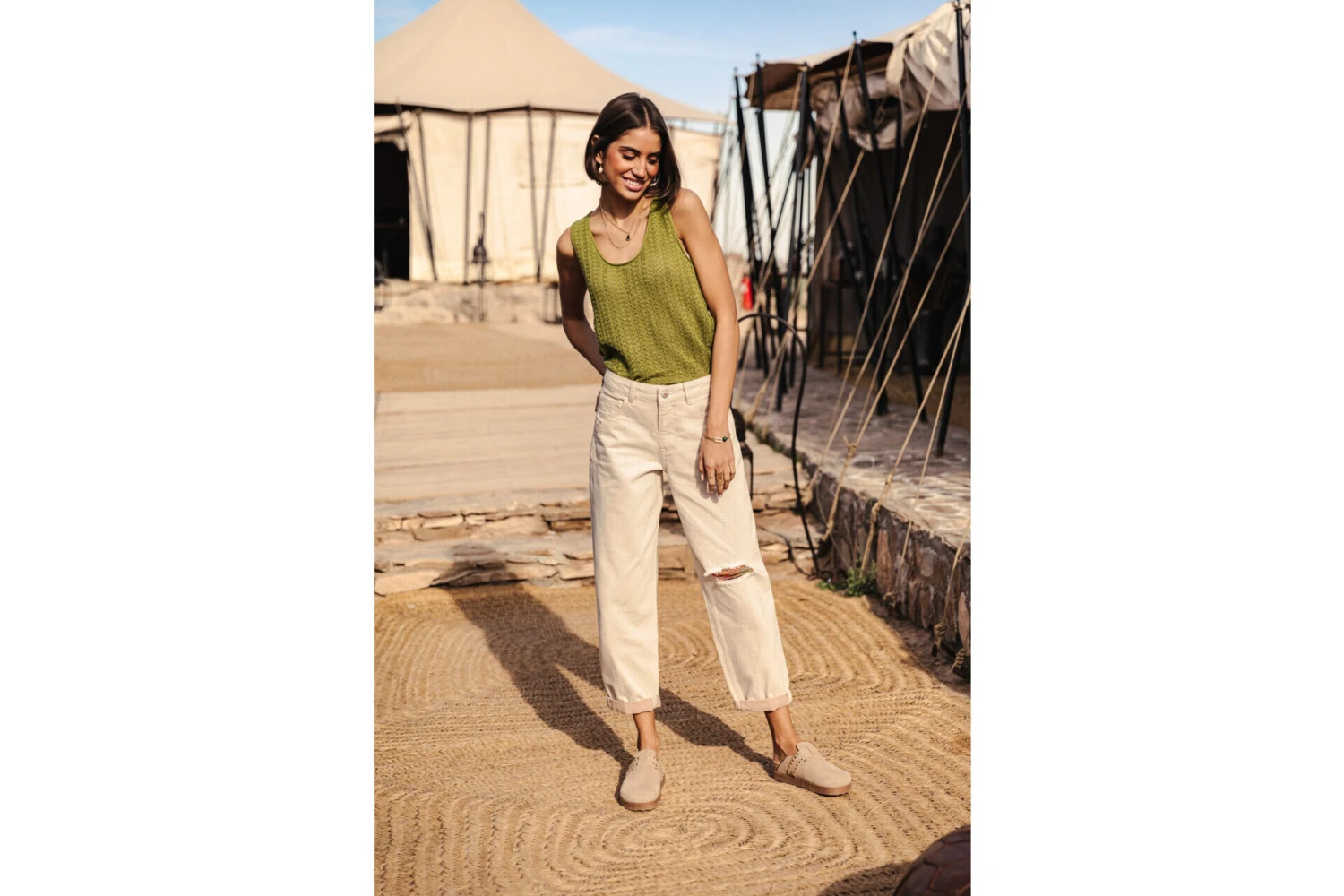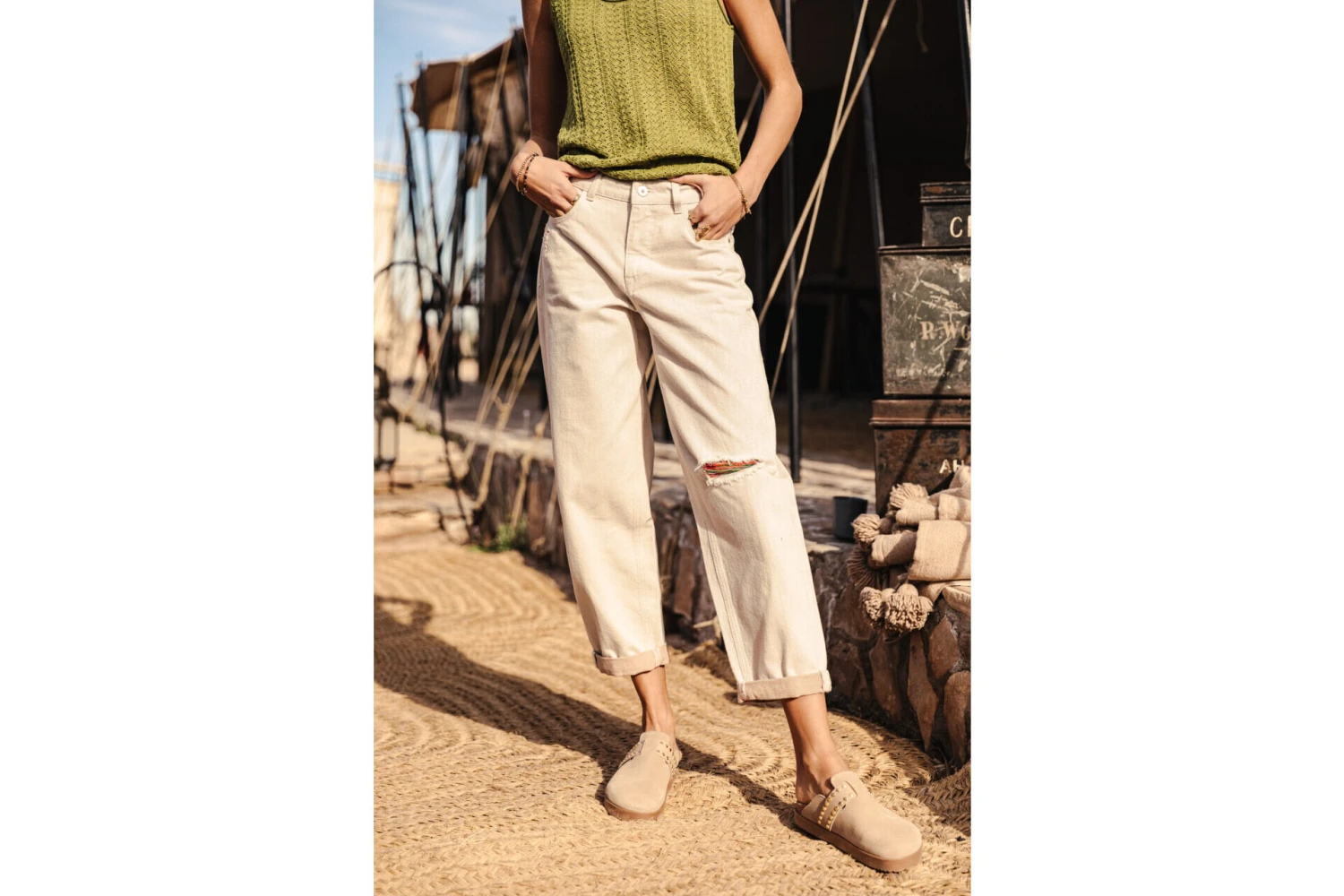 • Coupe broyfriend, jambe ample hanches et haut des cuisses puis se resserre en bas