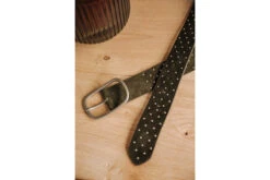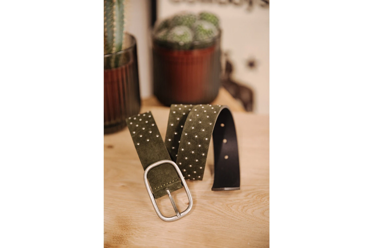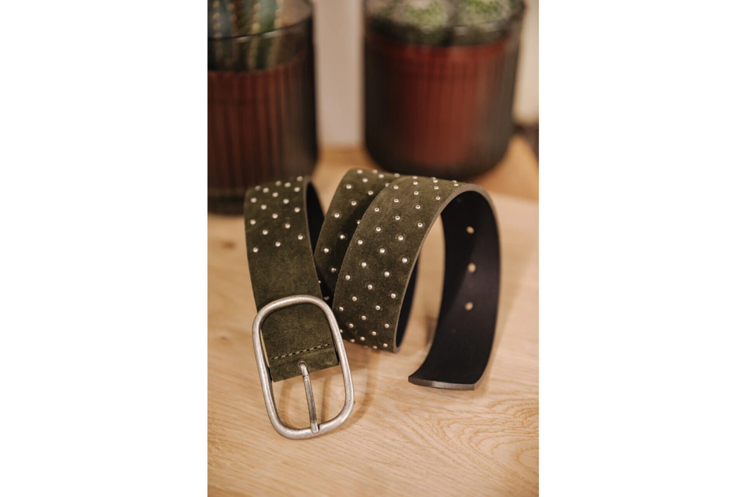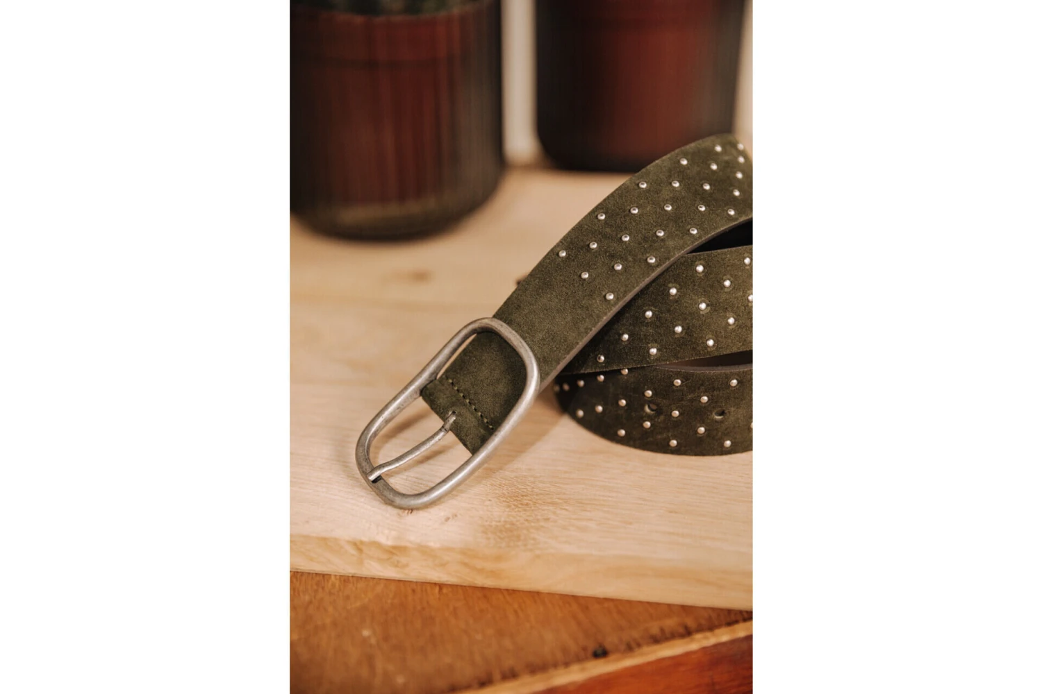⹠Ceinture en Daim agrémentée de clous en métal argenté travaillé et veilli