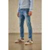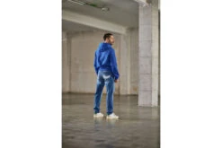 Délavage bleu moyen, usé avec déchirures