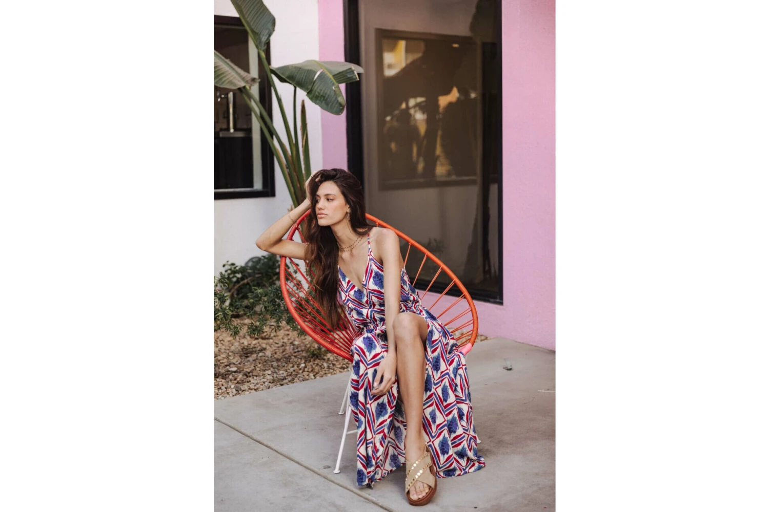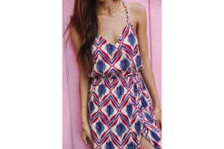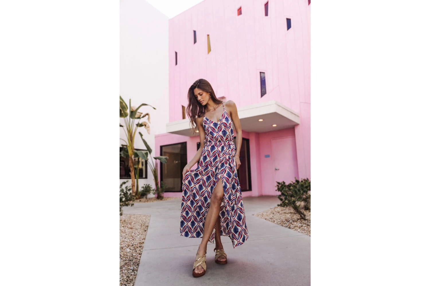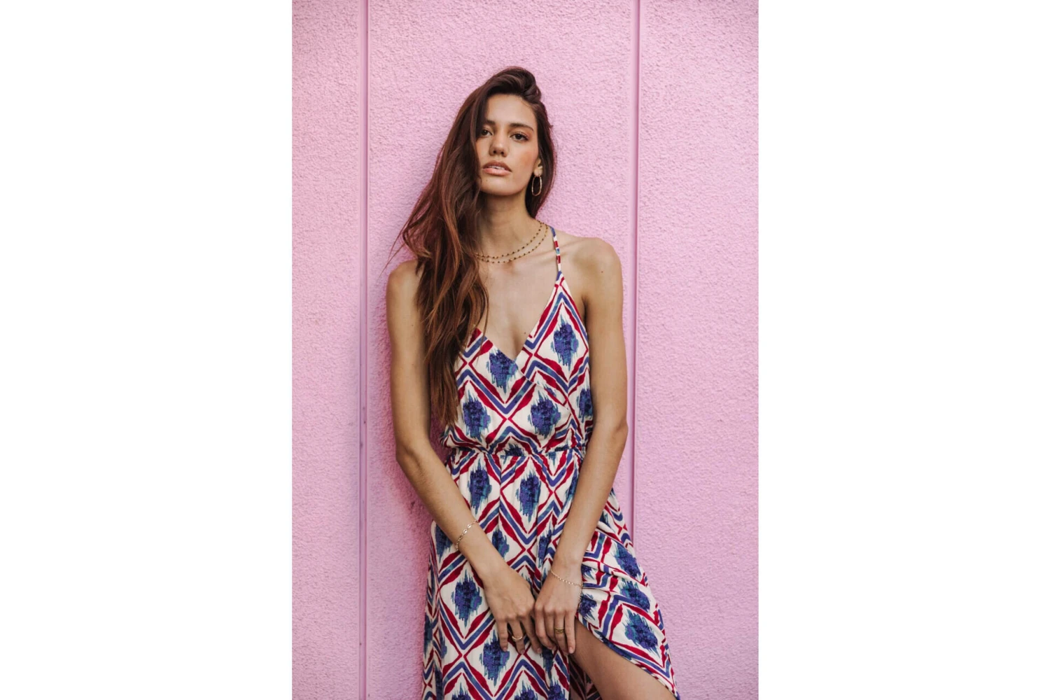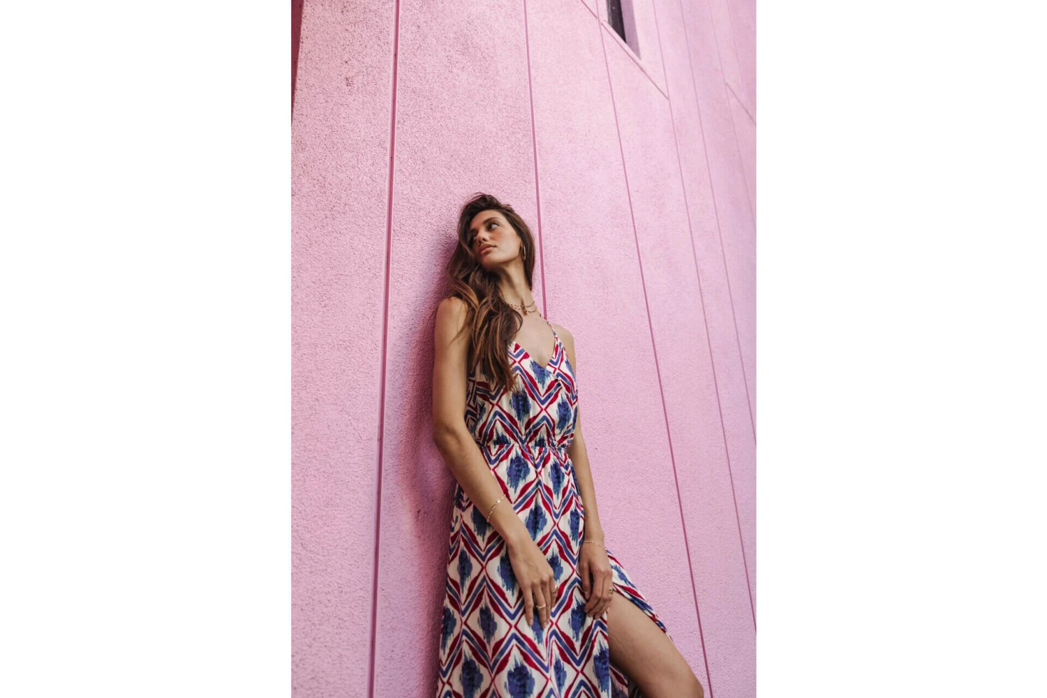 • Imprimé géométrique à losanges aquarellés de couleur bleu et rouge sur fond écru