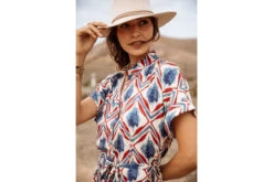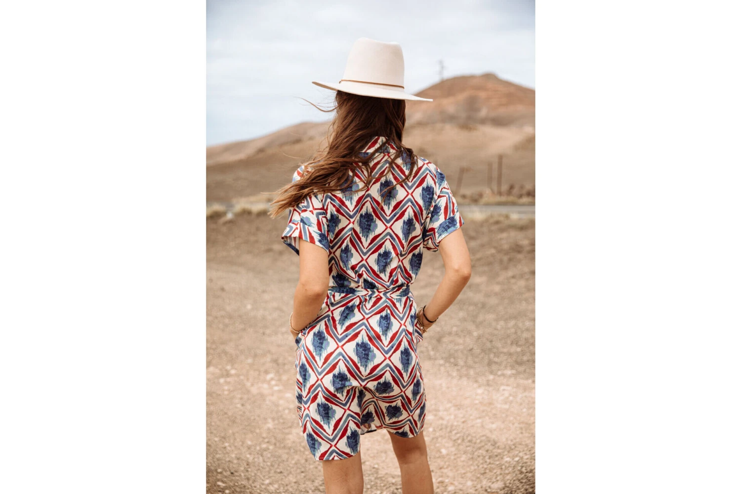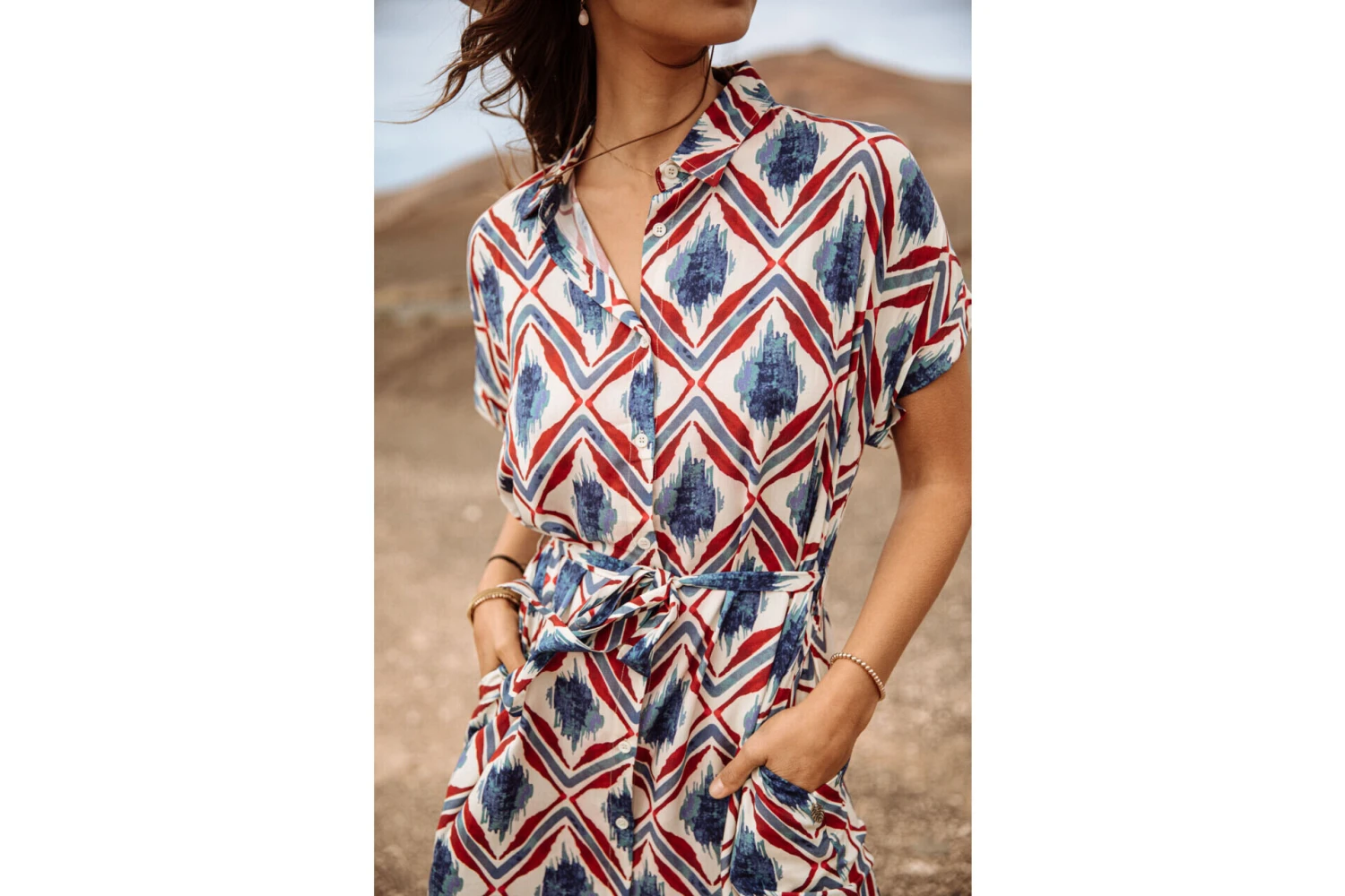 • Imprimé géométrique à losanges aquarellés de couleur bleu et rouge sur fond écru