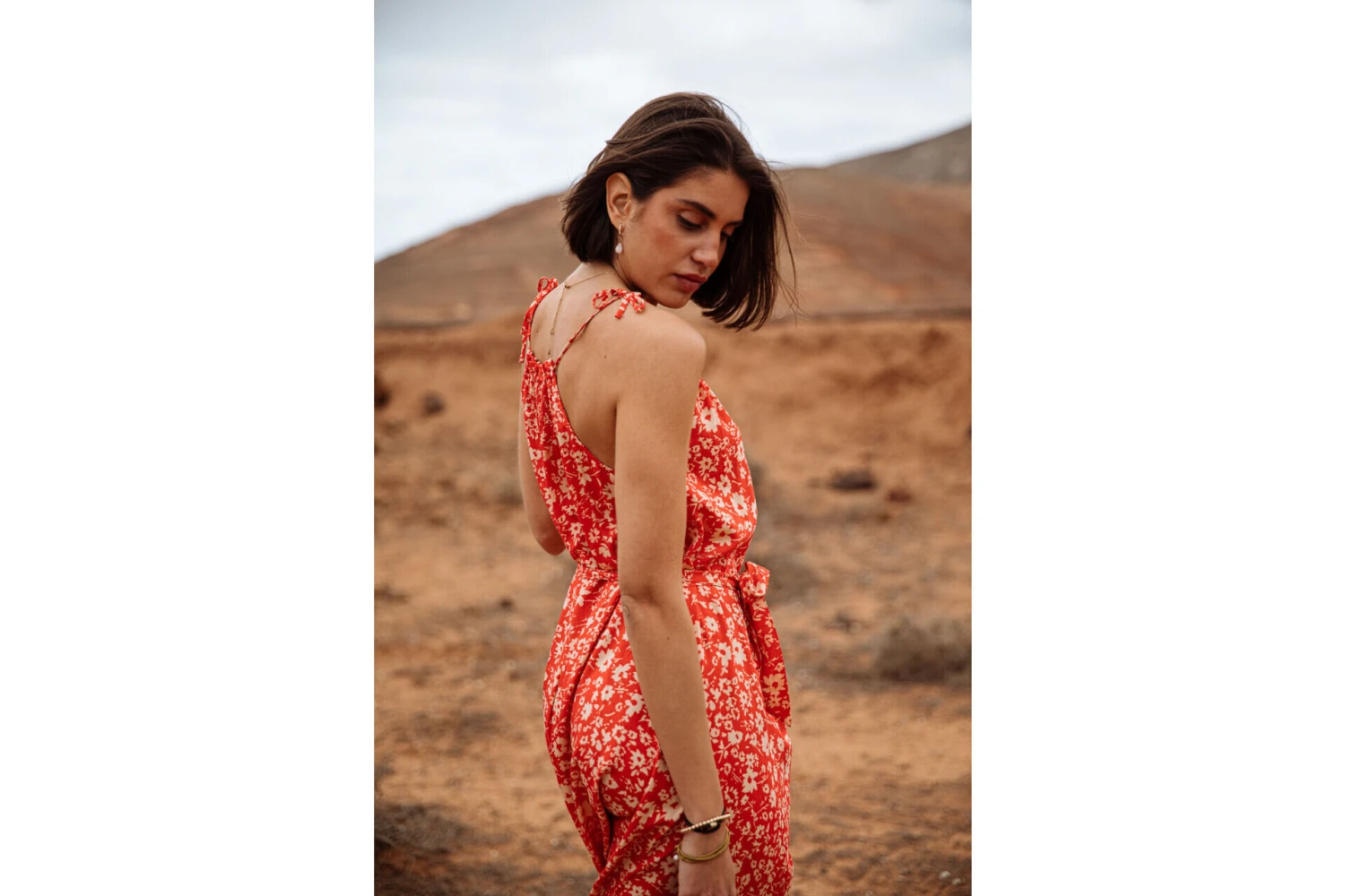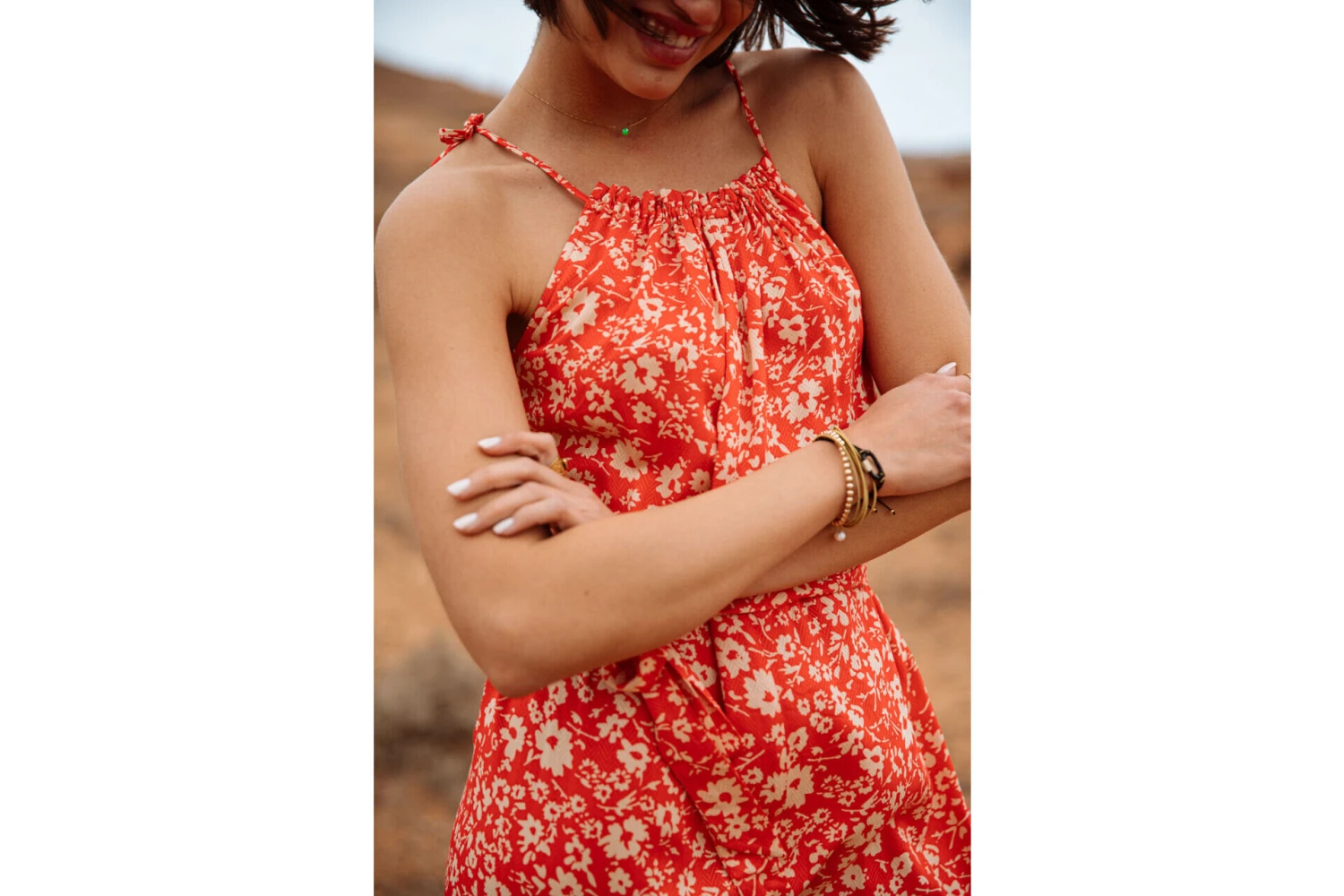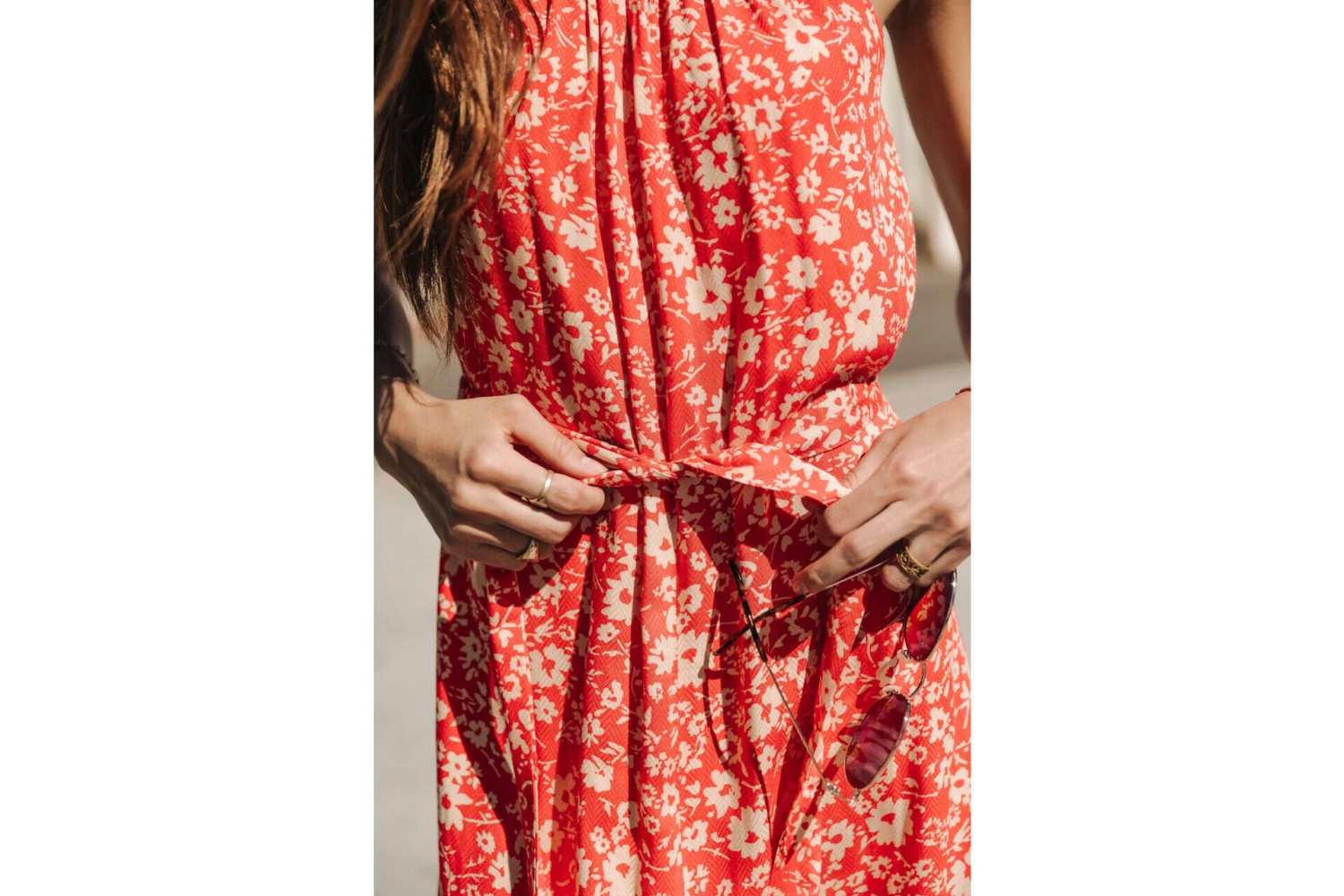 • Imprimé à fleurs écrues sur fond rouge étincellant
