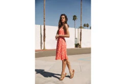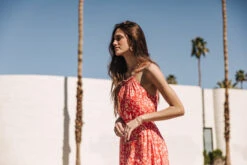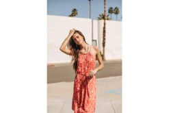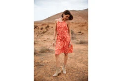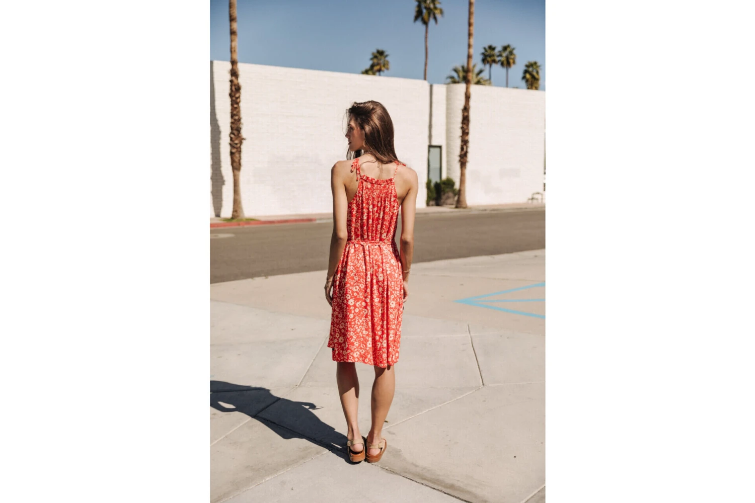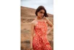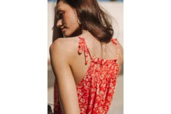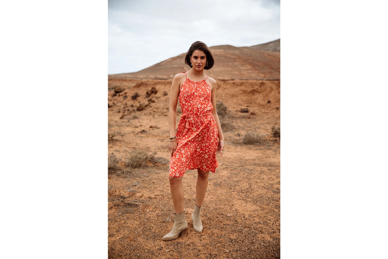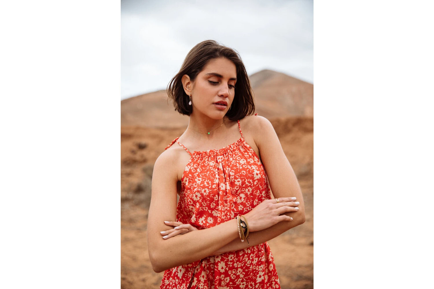 • Imprimé à fleurs écrues sur fond rouge étincellant