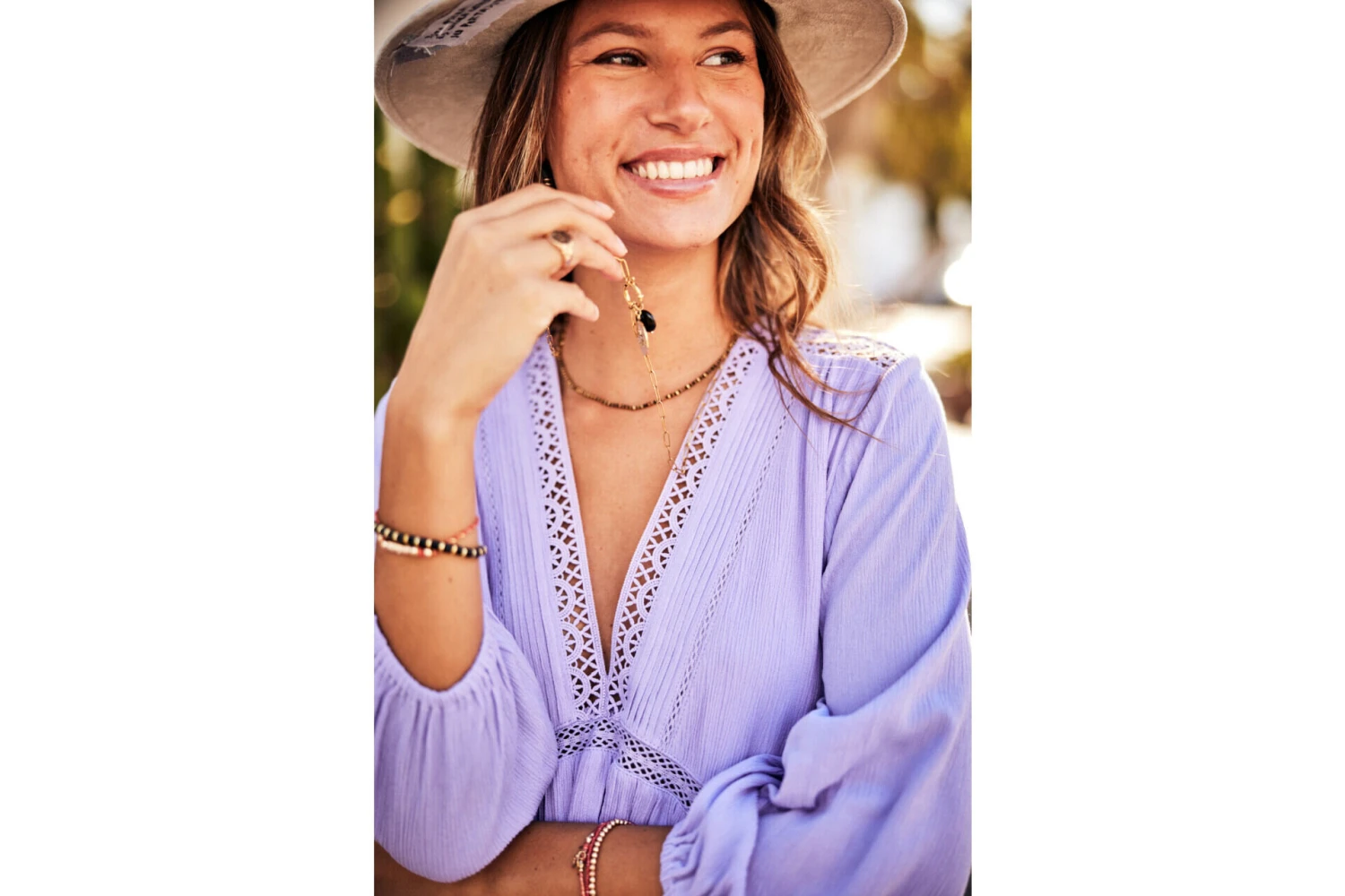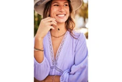 • Galons de dentelle Ă la dĂ©coupe sous la poitrine, le long de l’encolure et Ă la carrure dos