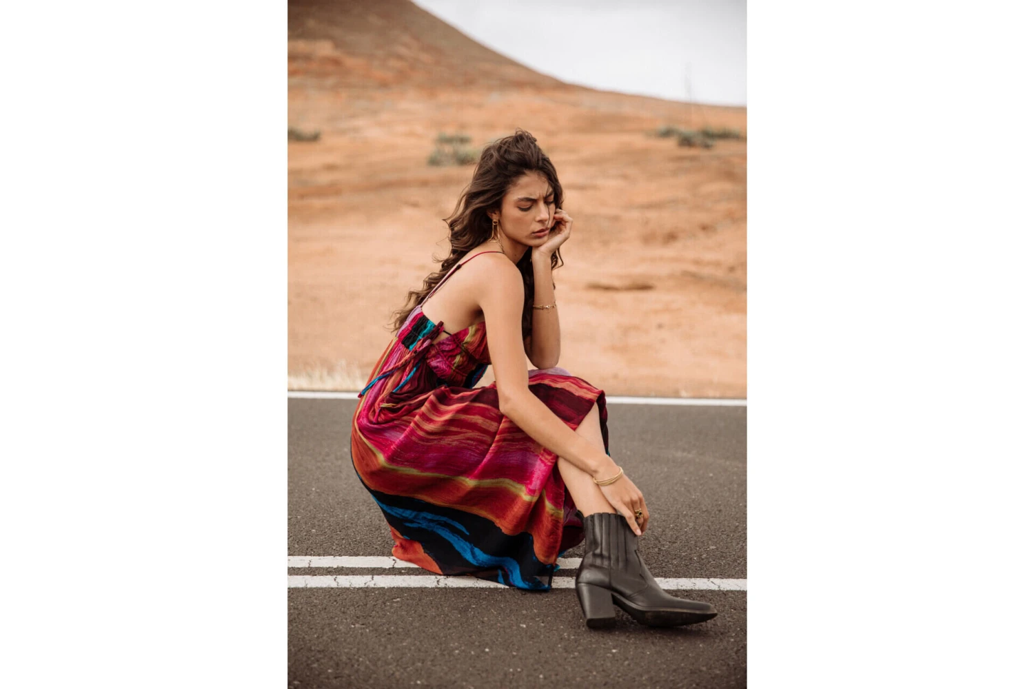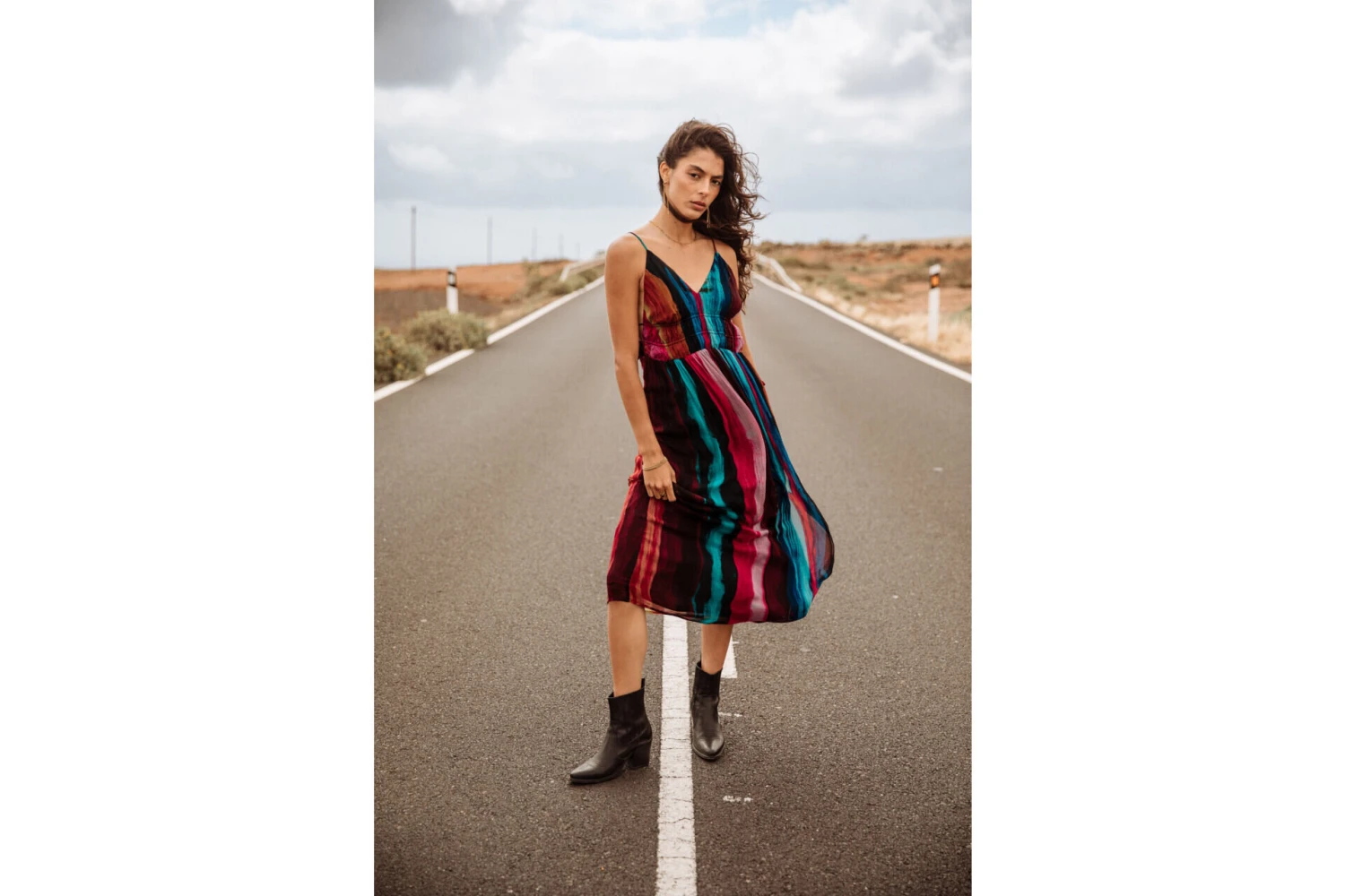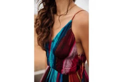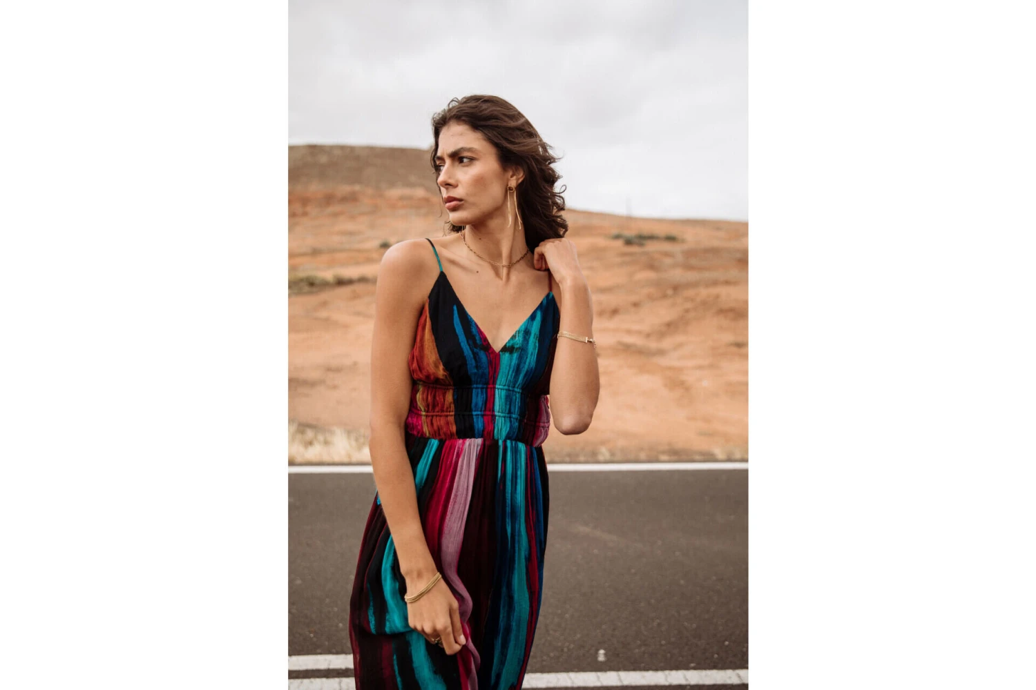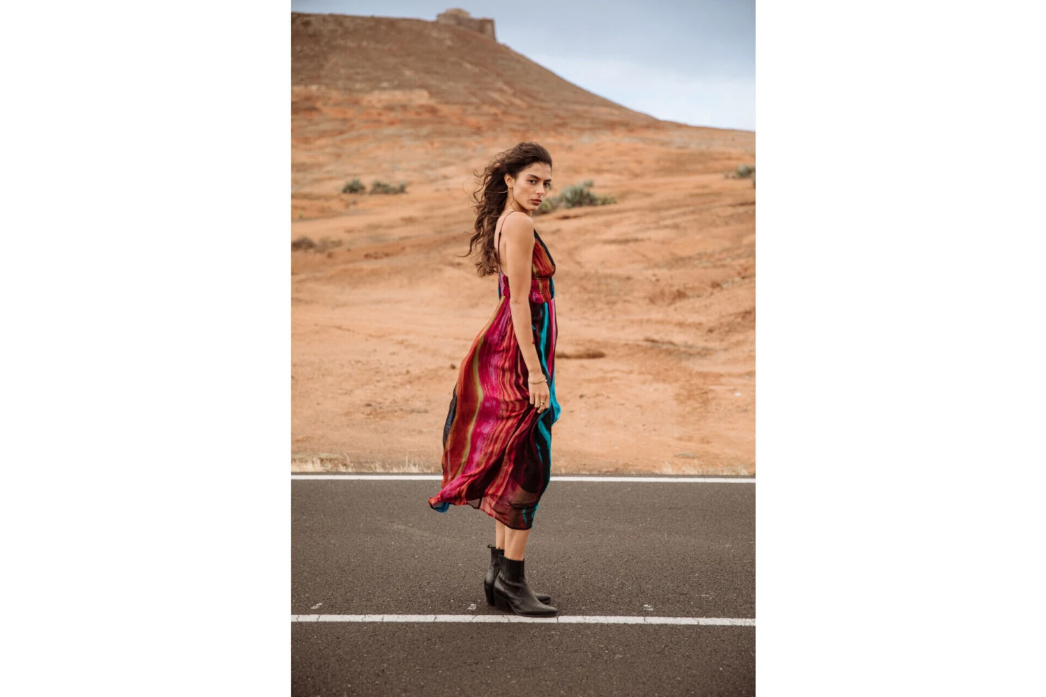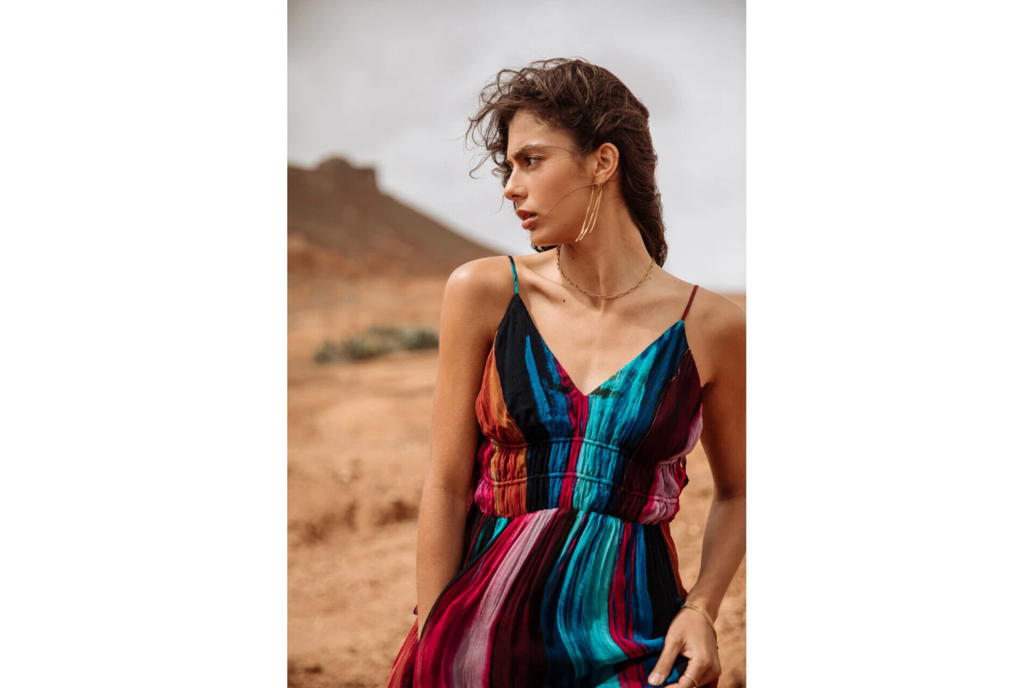 • Robe longue à bretelles dans un voile imprimé multicolore, fluide et froissé