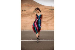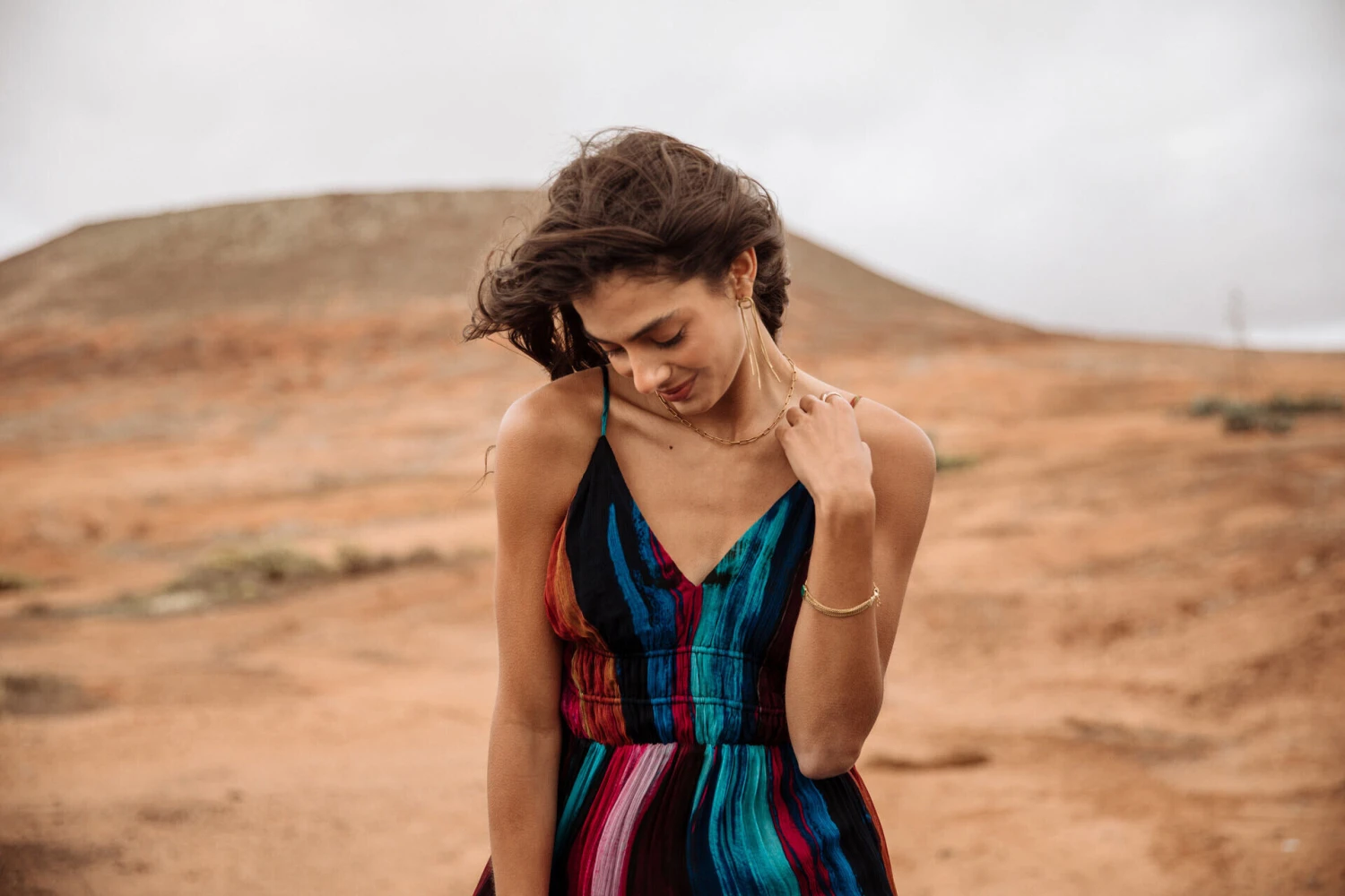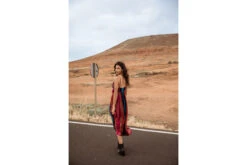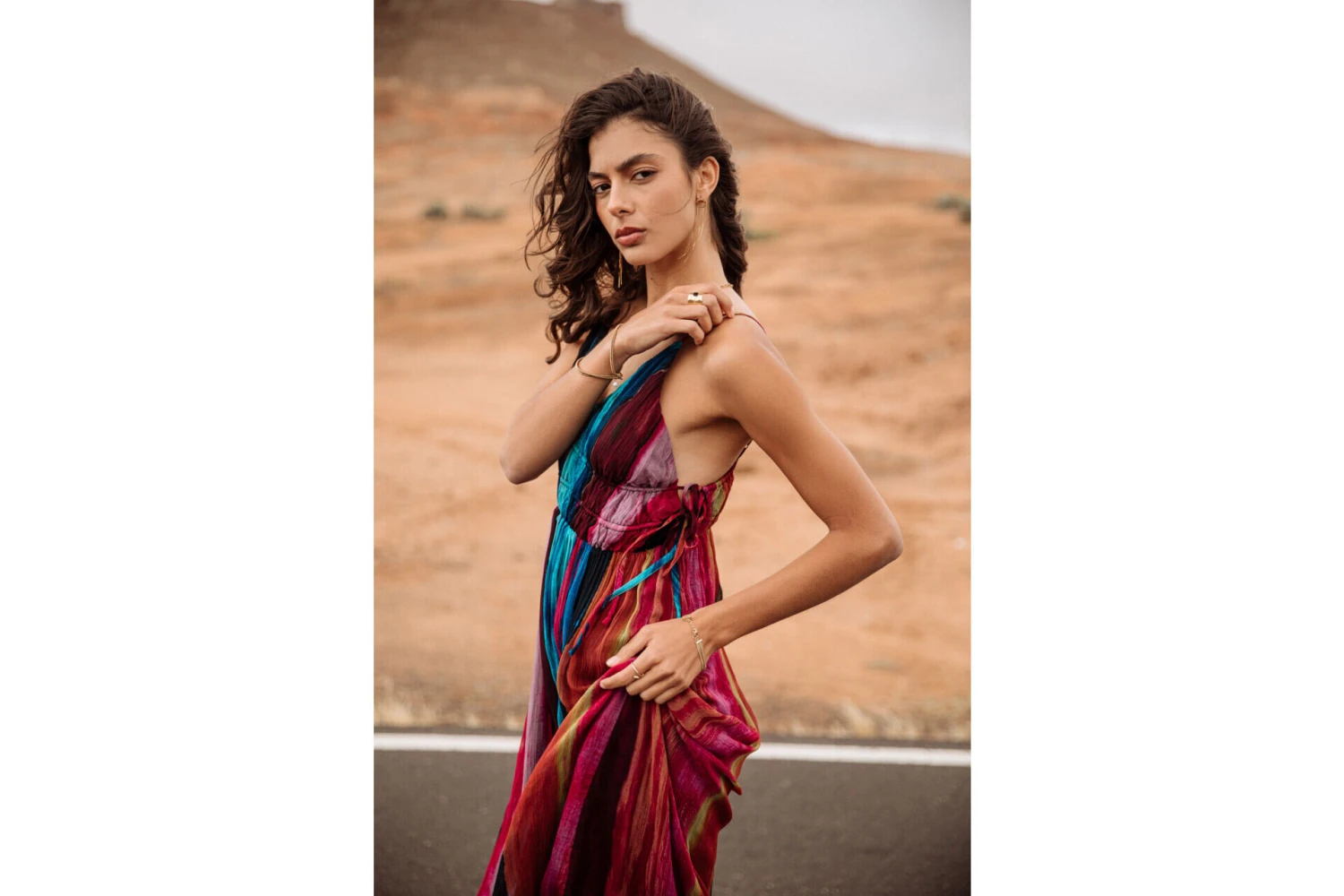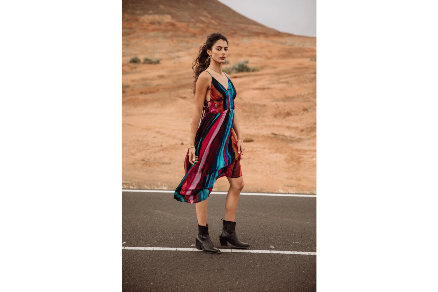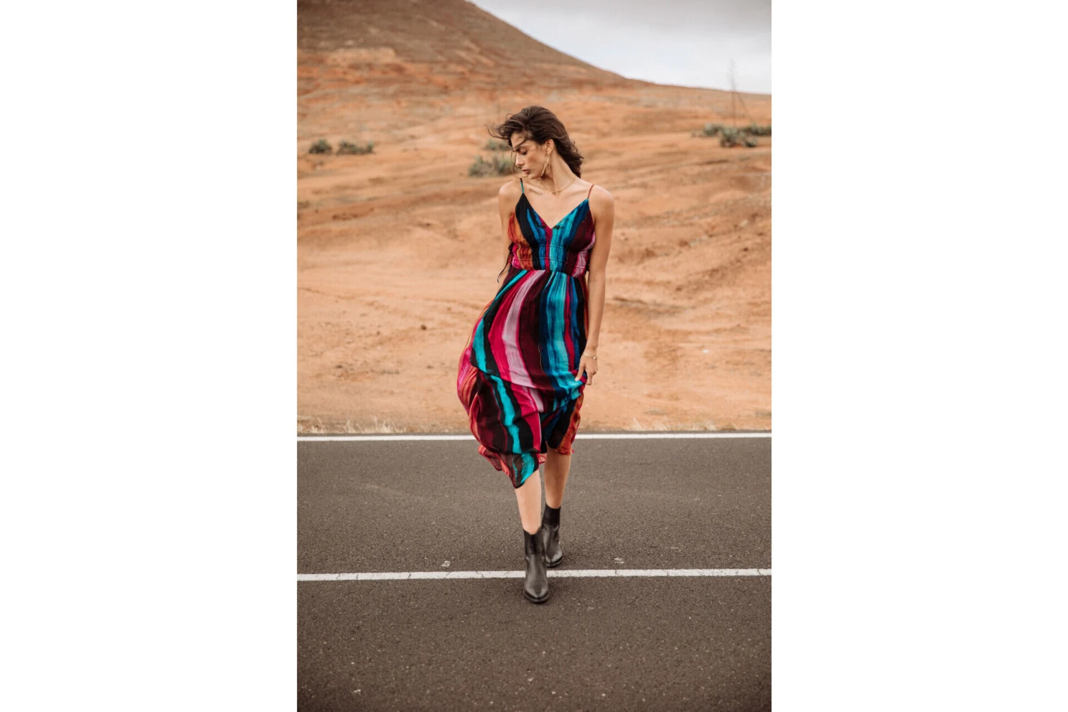 • Robe longue à bretelles dans un voile imprimé multicolore, fluide et froissé