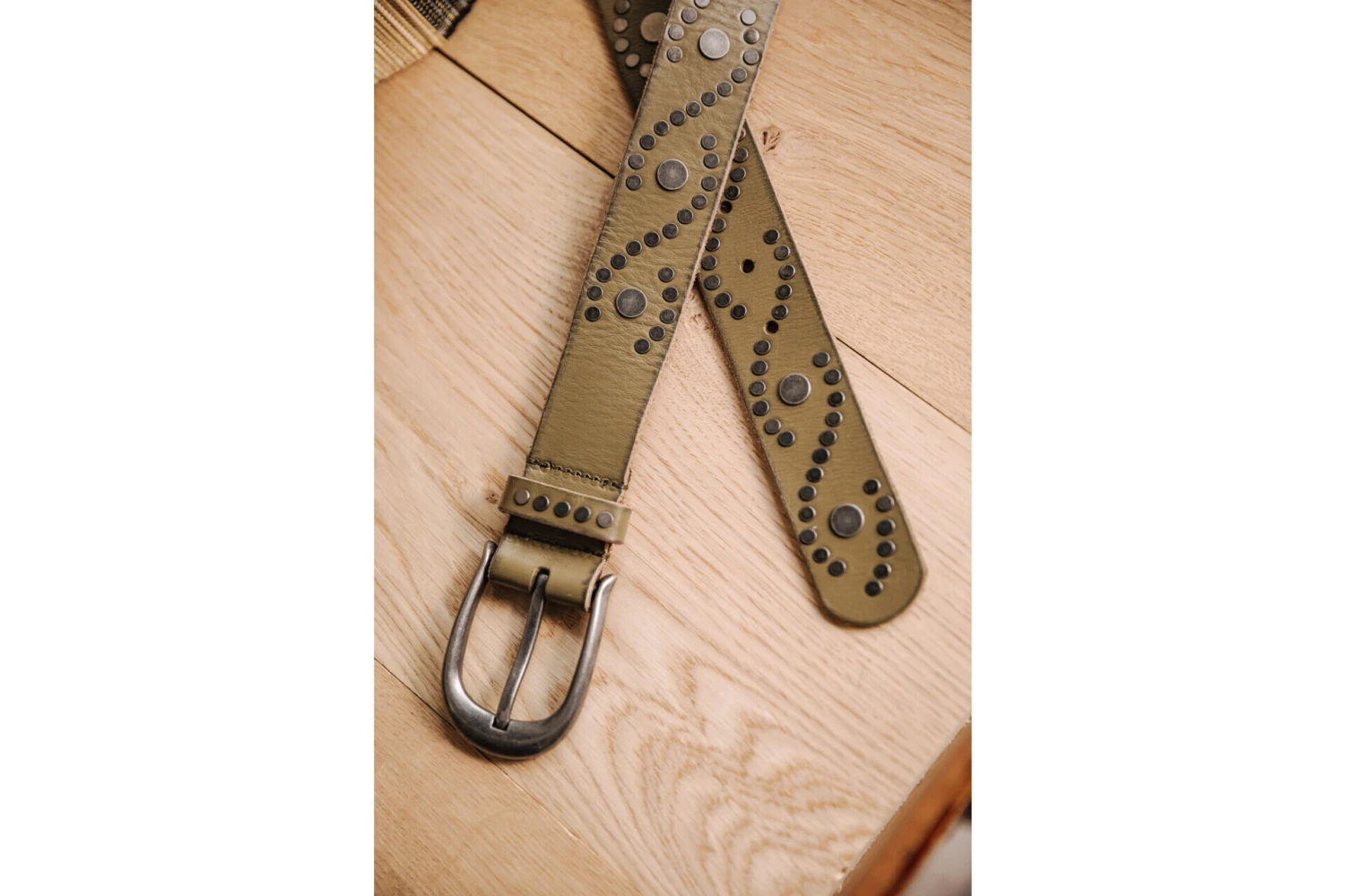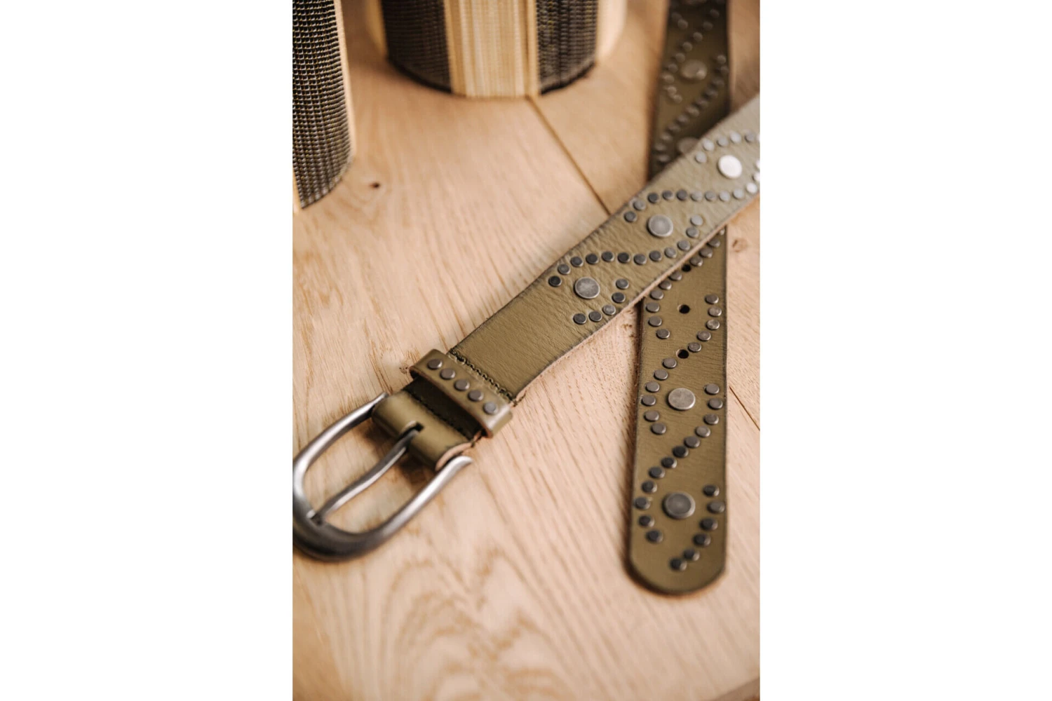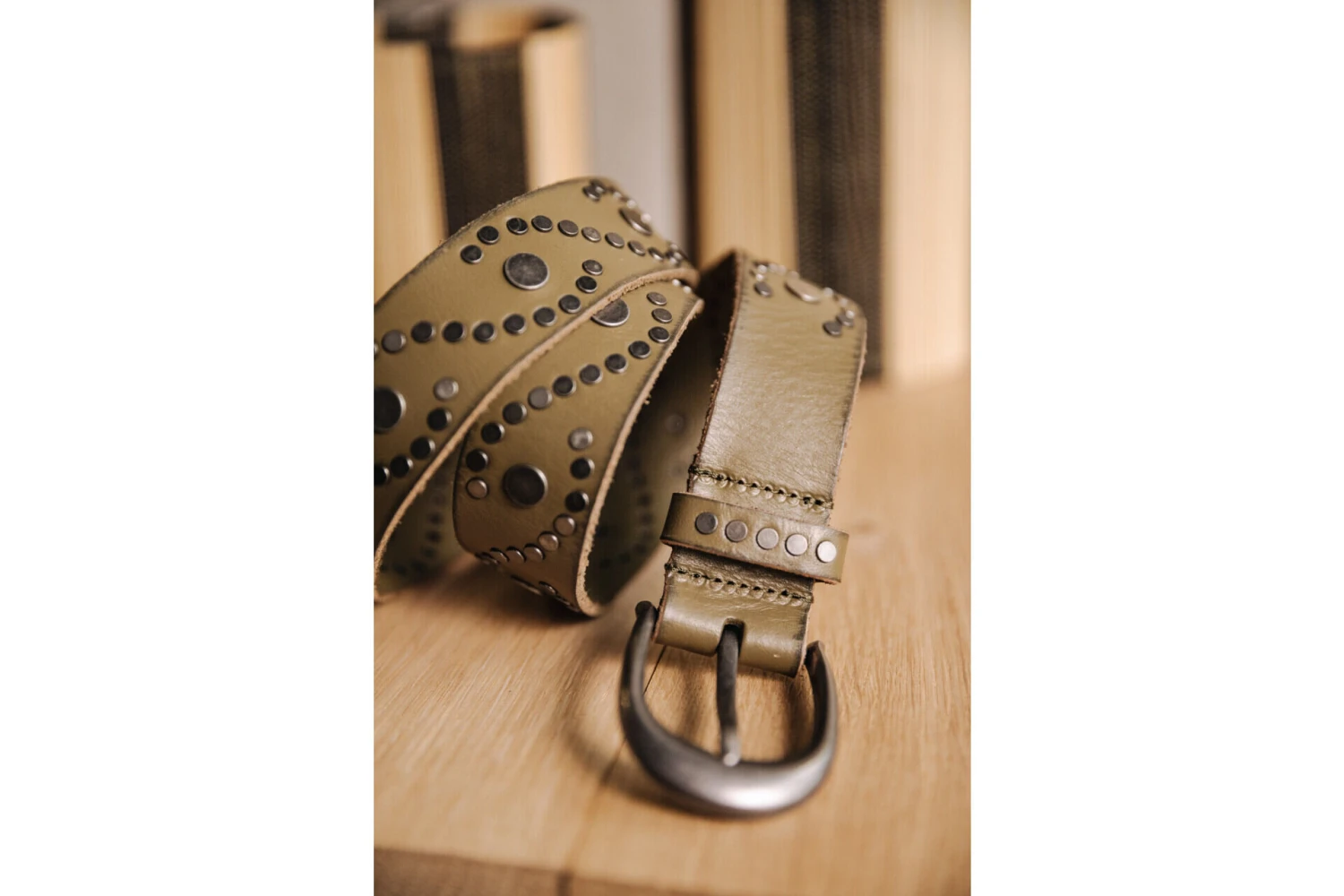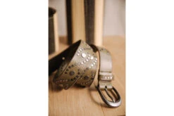 • Ceinture en Cuir agrémentée de clous en métal argenté travaillé et veilli