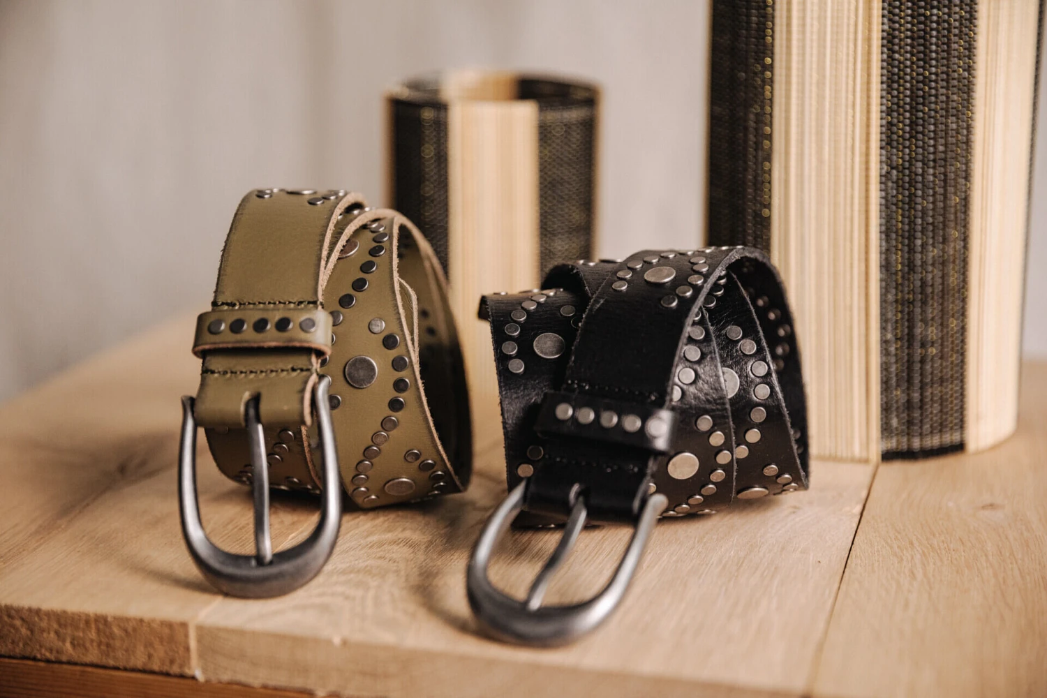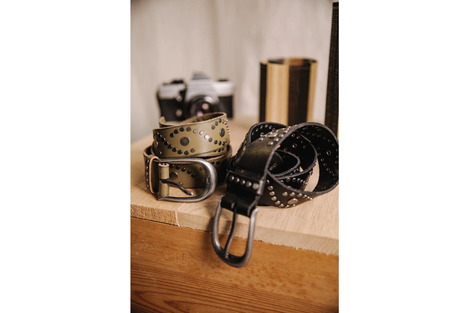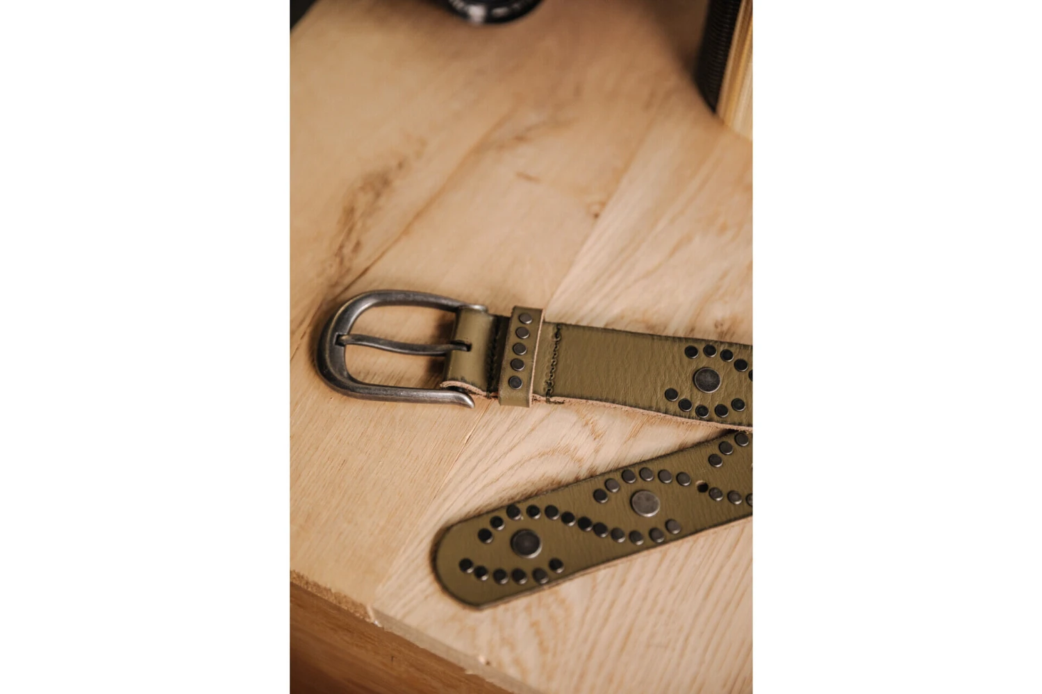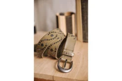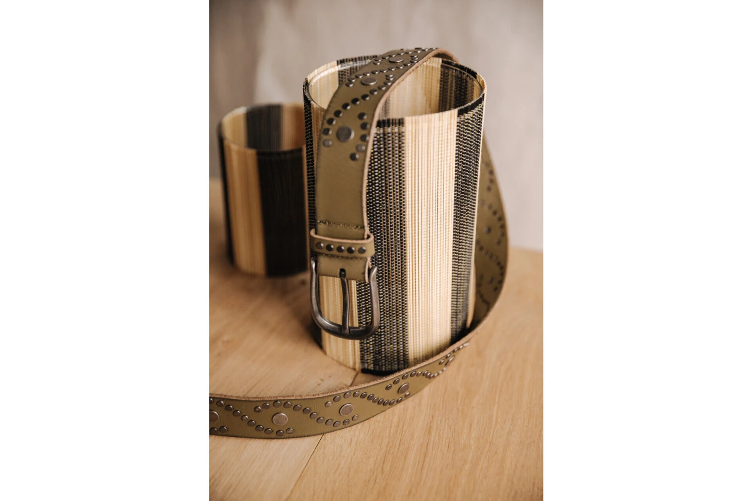 • Ceinture en Cuir agrémentée de clous en métal argenté travaillé et veilli