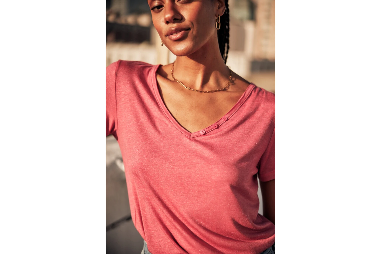 ⹠Col V coupé bord franc avec petits boutons ton sur ton sur le bas du col à gauche