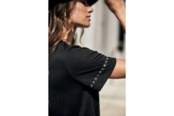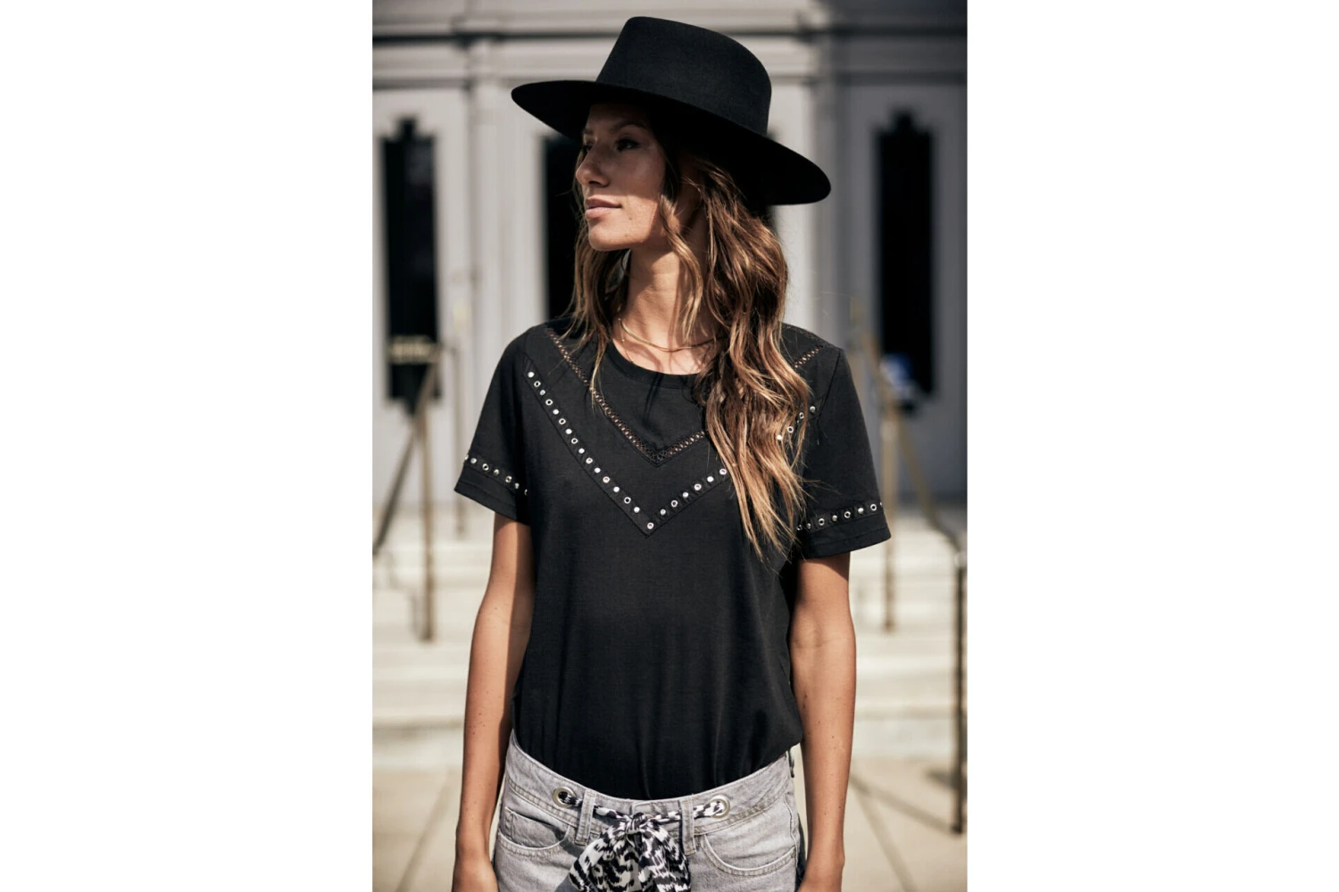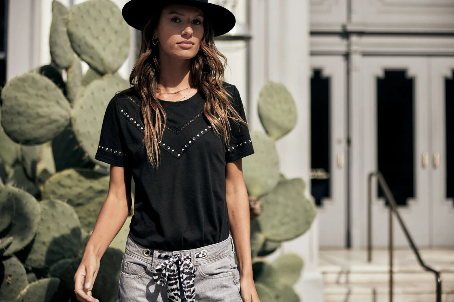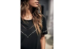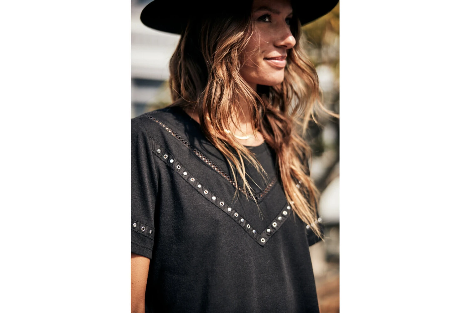 • Jours échelle et bandes à clous et oeilets sur le devant, les épaules et les manches