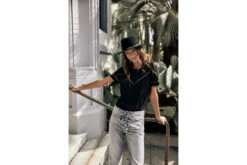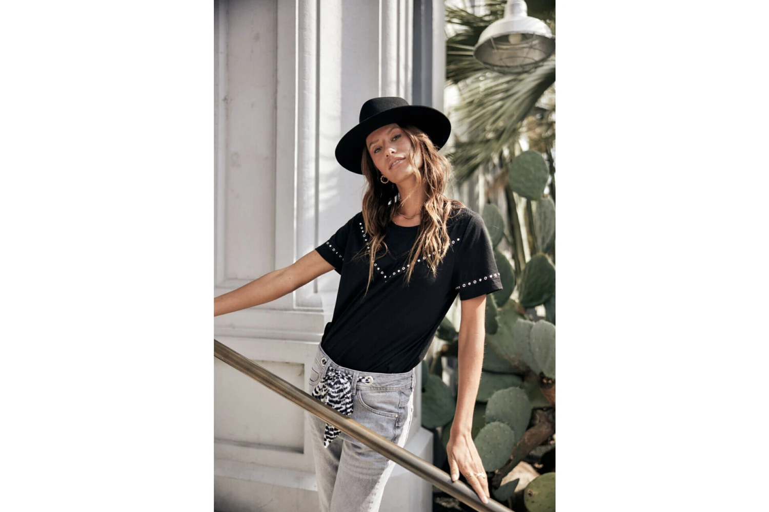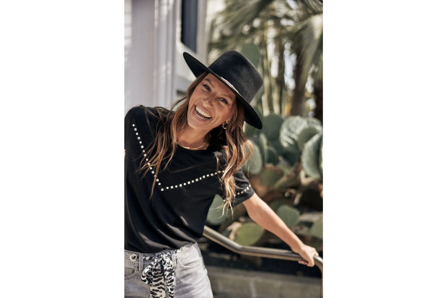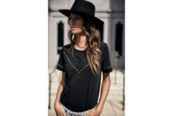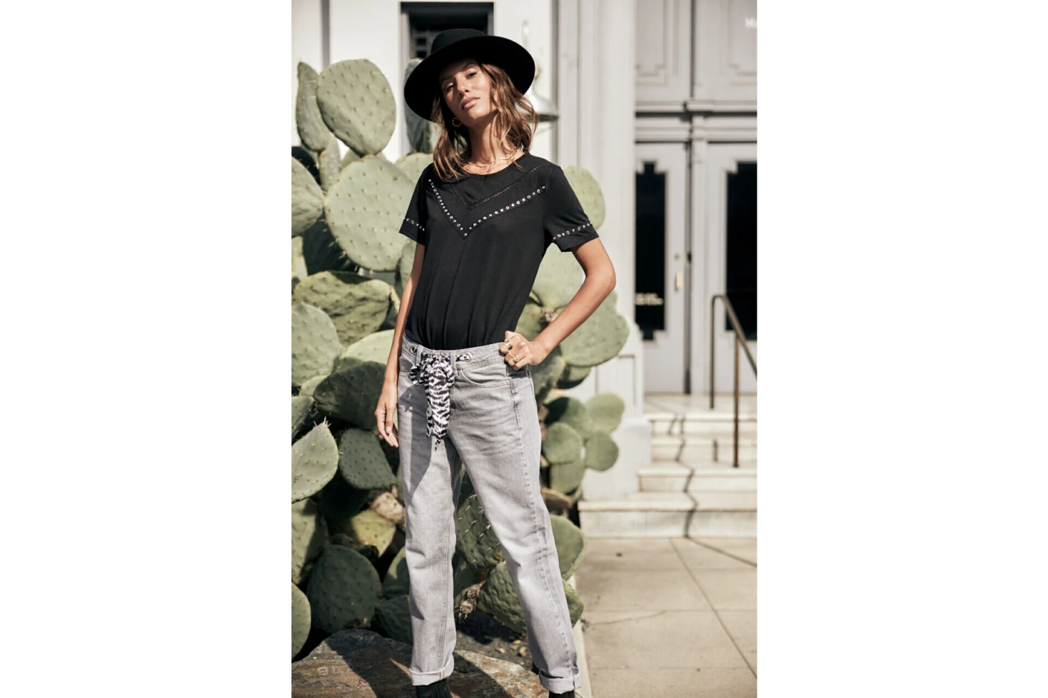 • Jours échelle et bandes à clous et oeilets sur le devant, les épaules et les manches