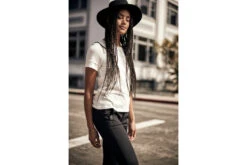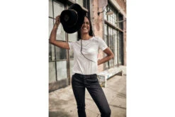 Anne-Sophie mesure 173 cm et porte une taille 27.