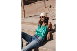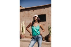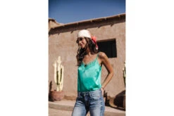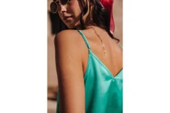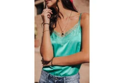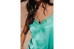 • Encolure profonde en « V »avec superposition de dentelle sur le tissu