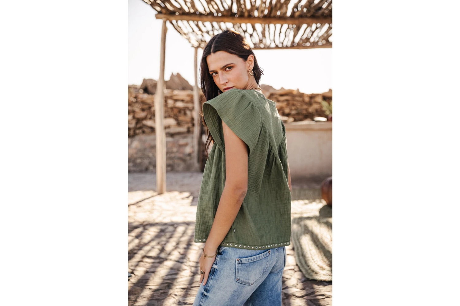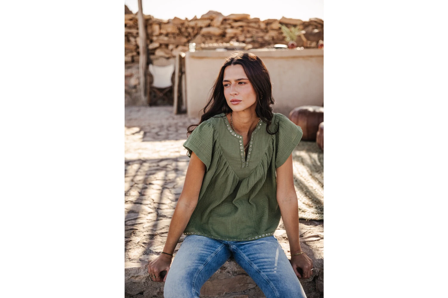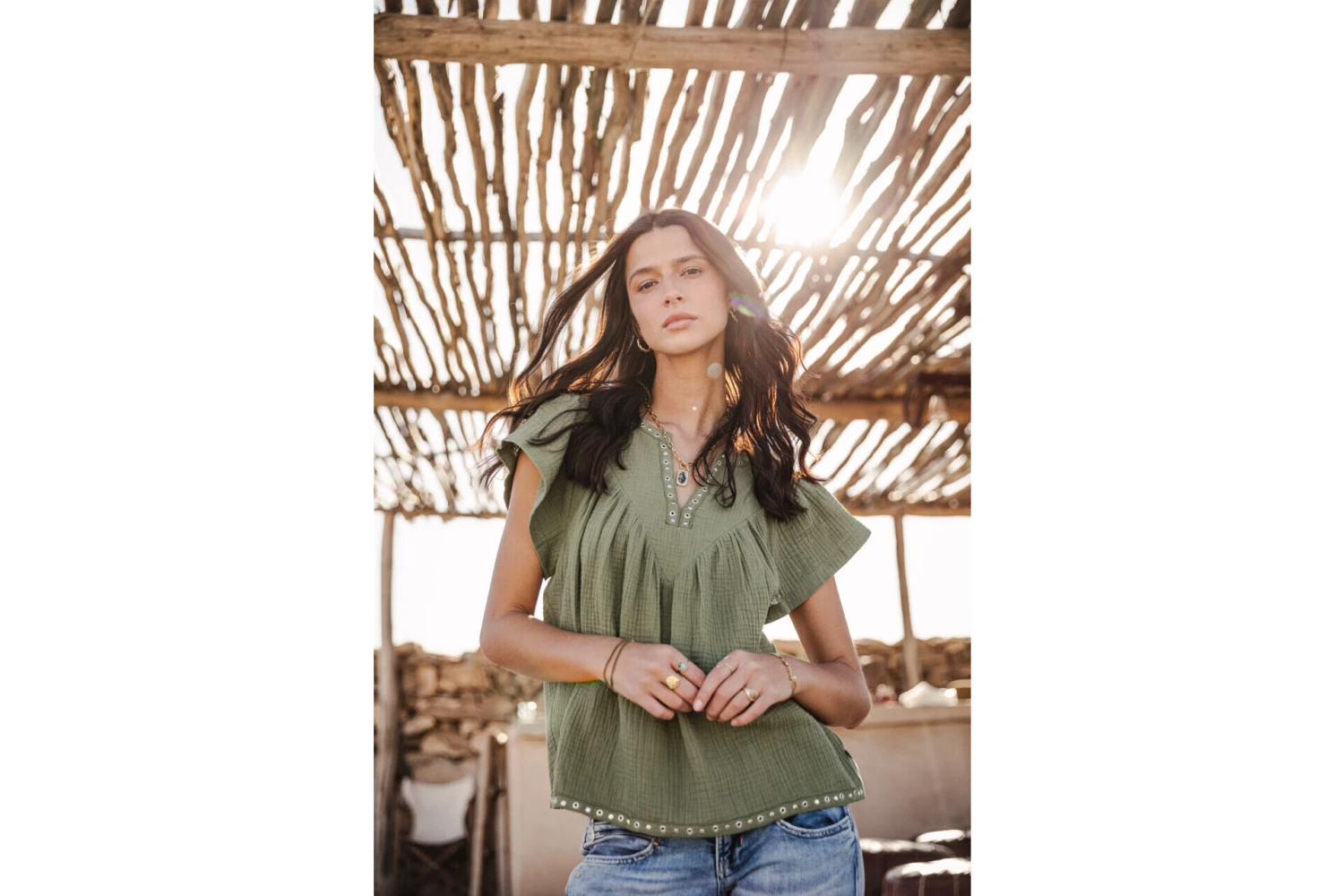 • Galon rock avec clous et Ĺ“illets le long de l’encolure et du bas de vĂŞtement