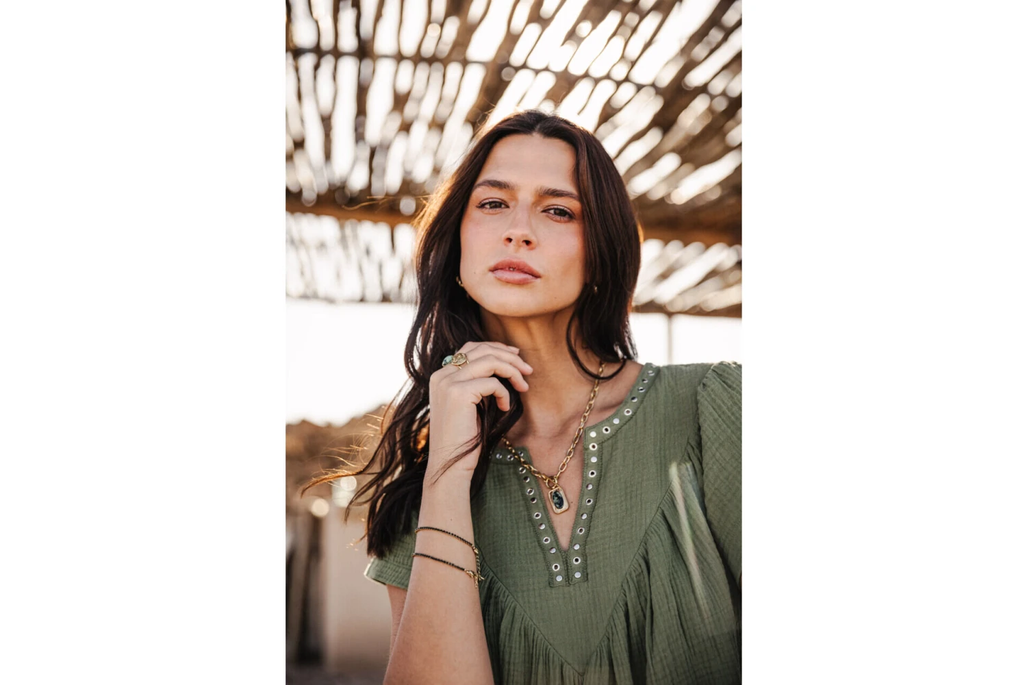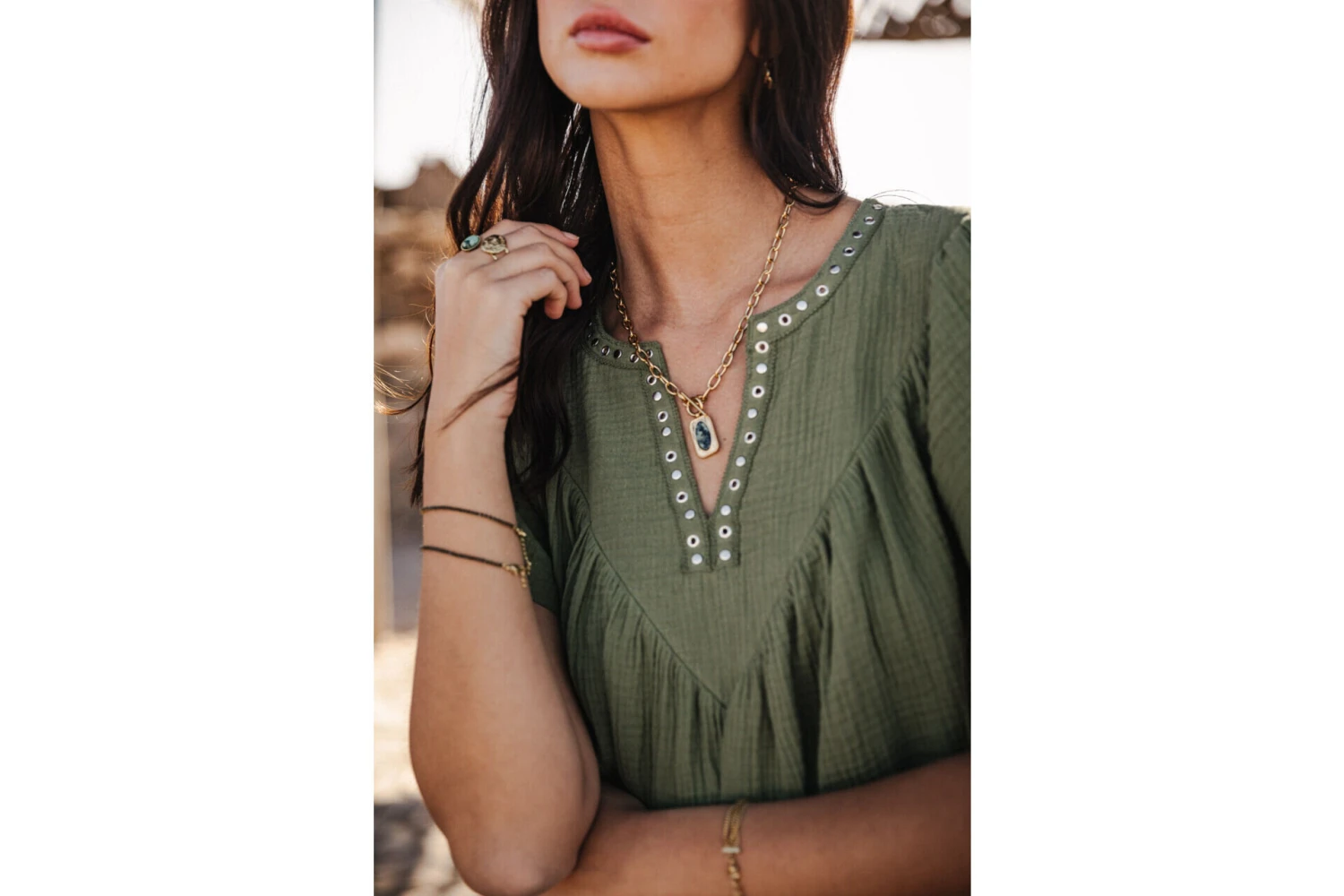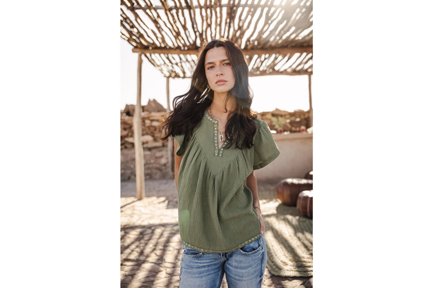 • Galon rock avec clous et Ĺ“illets le long de l’encolure et du bas de vĂŞtement