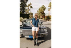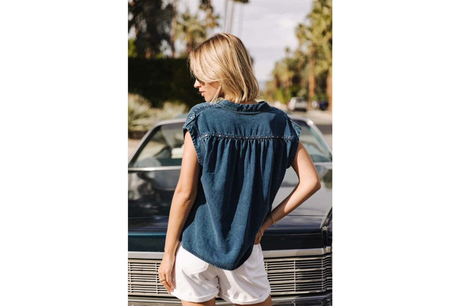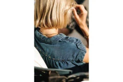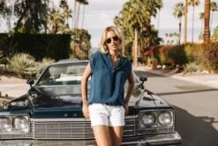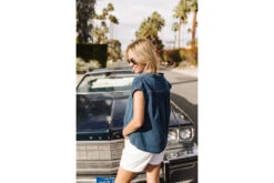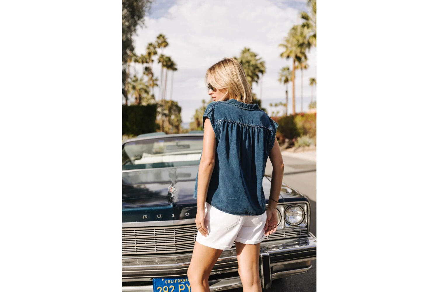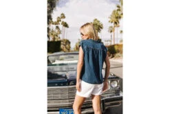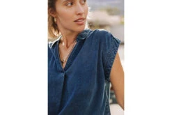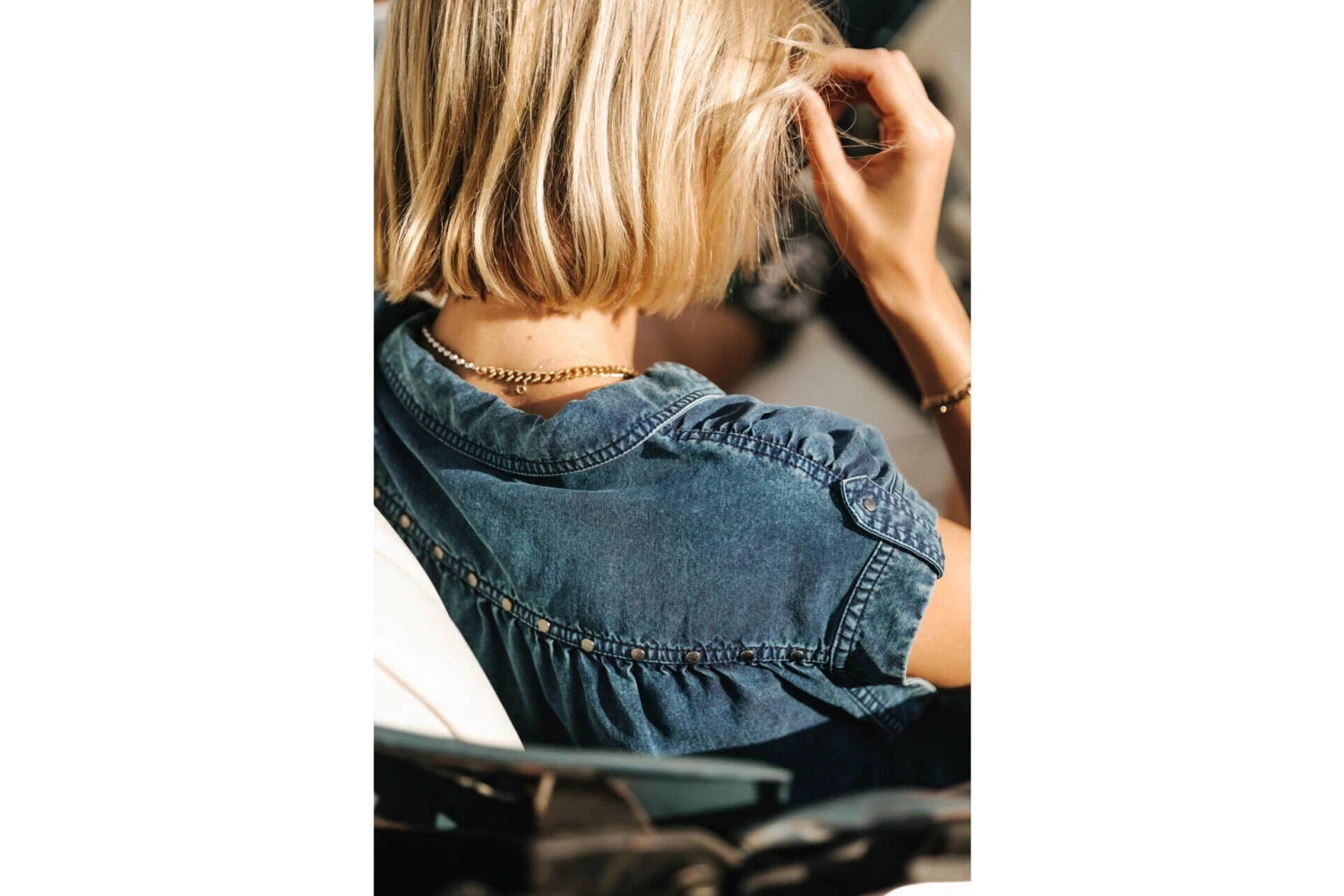 • Épaules tombantes avec revers aux emmenchures et petite patte avec bouton