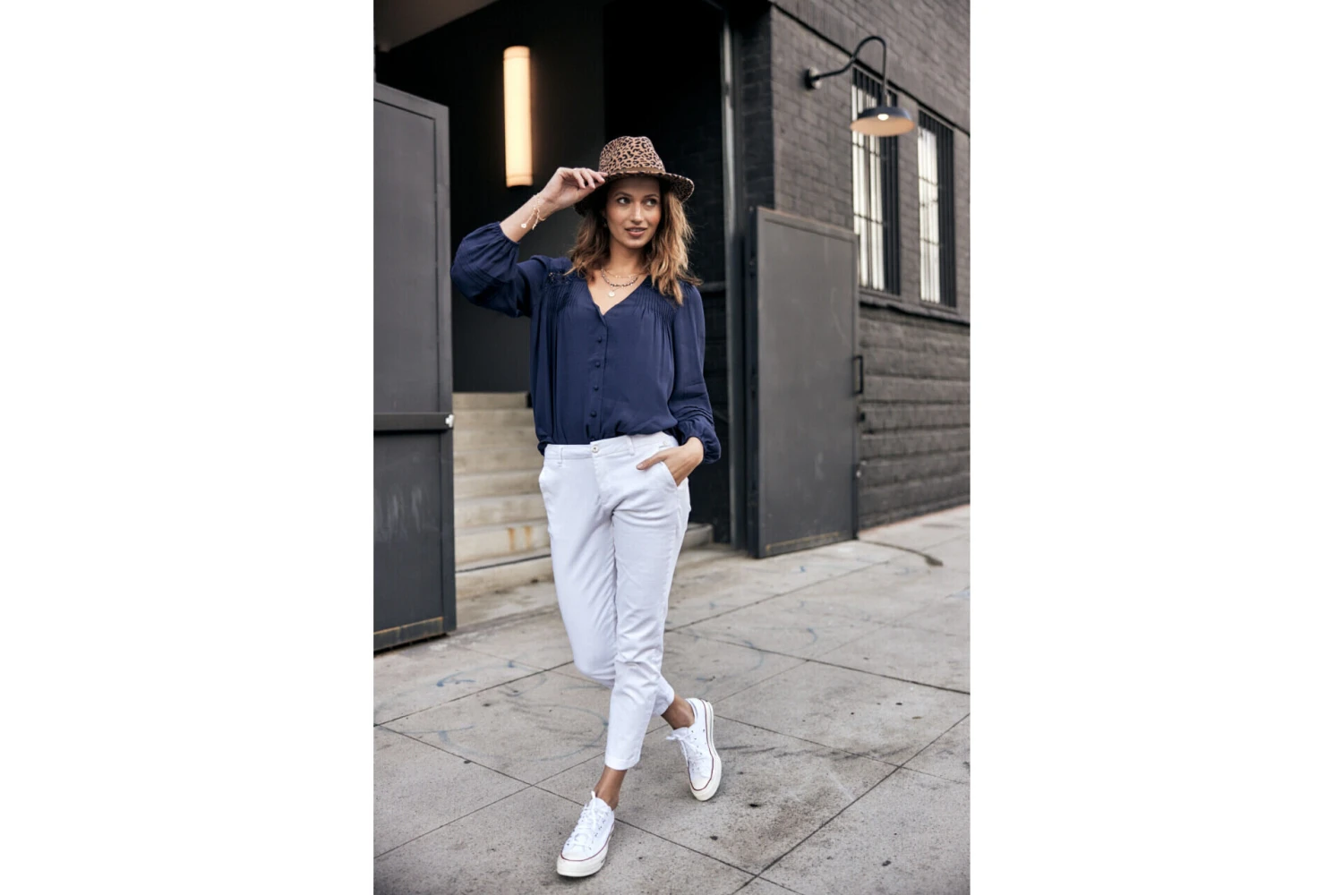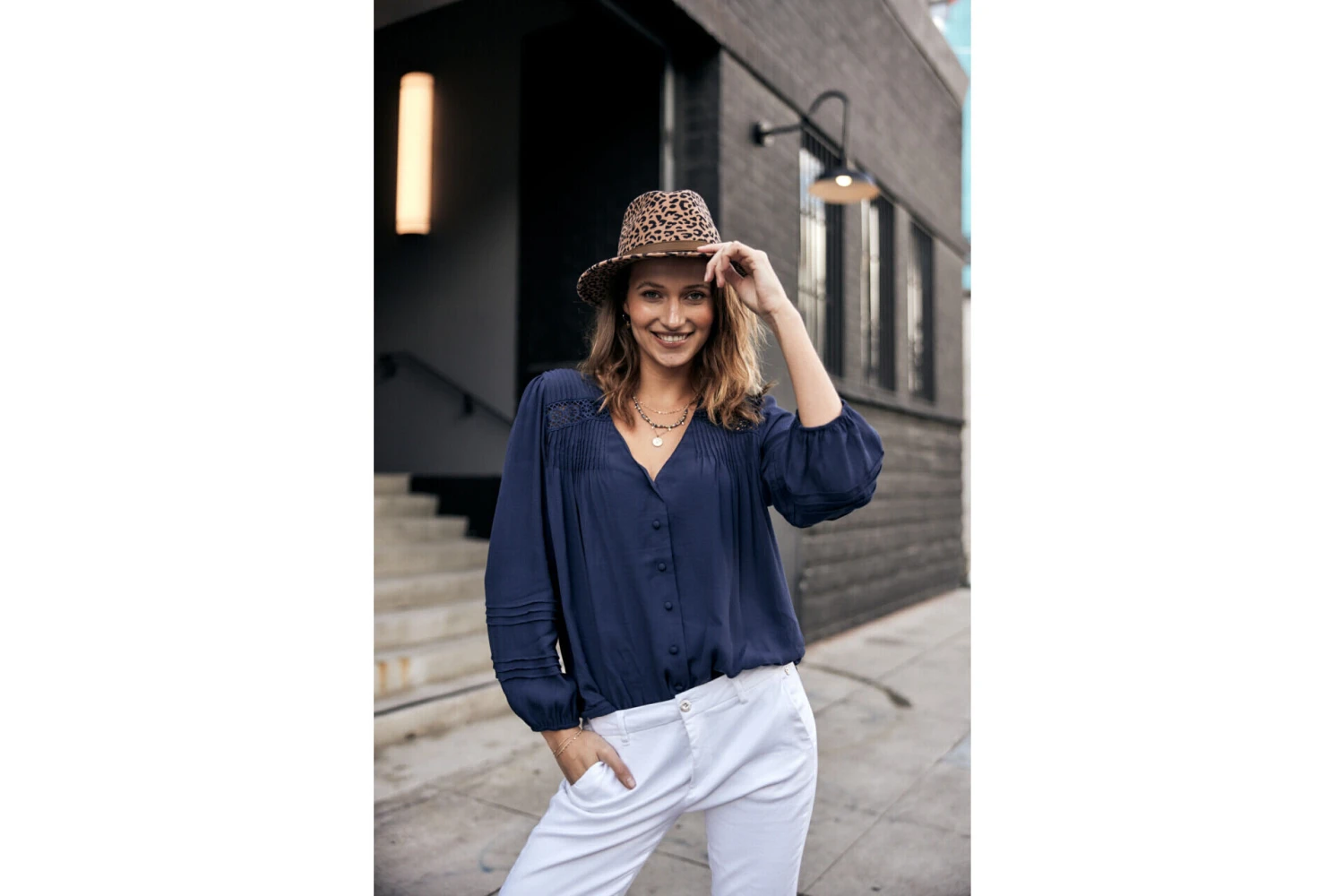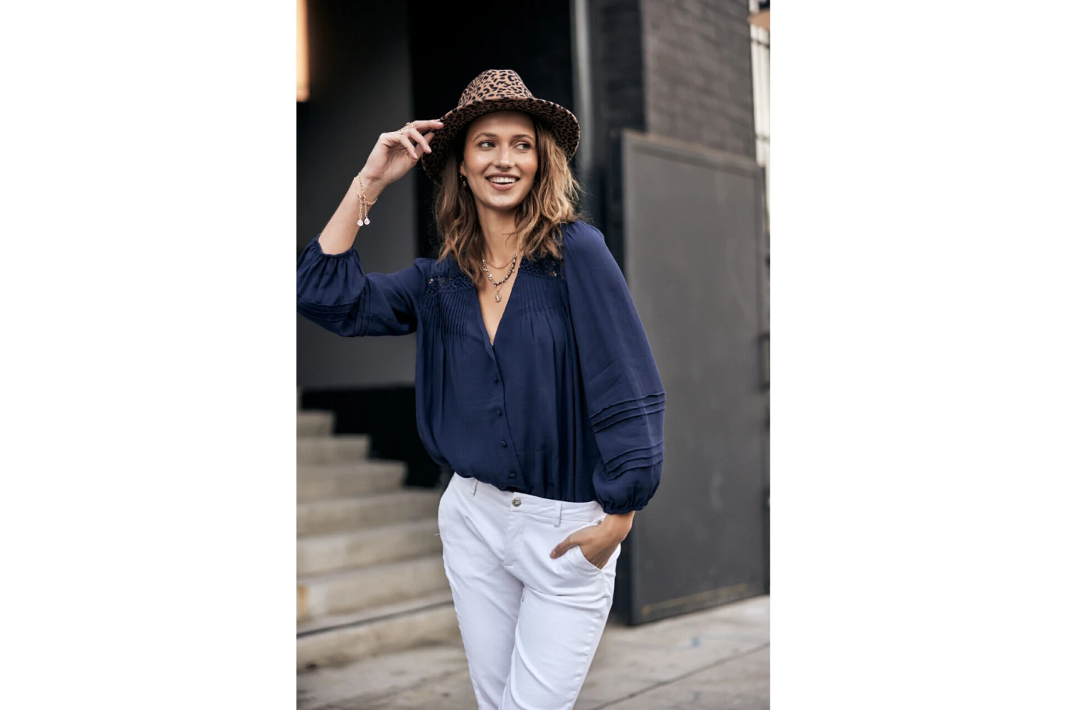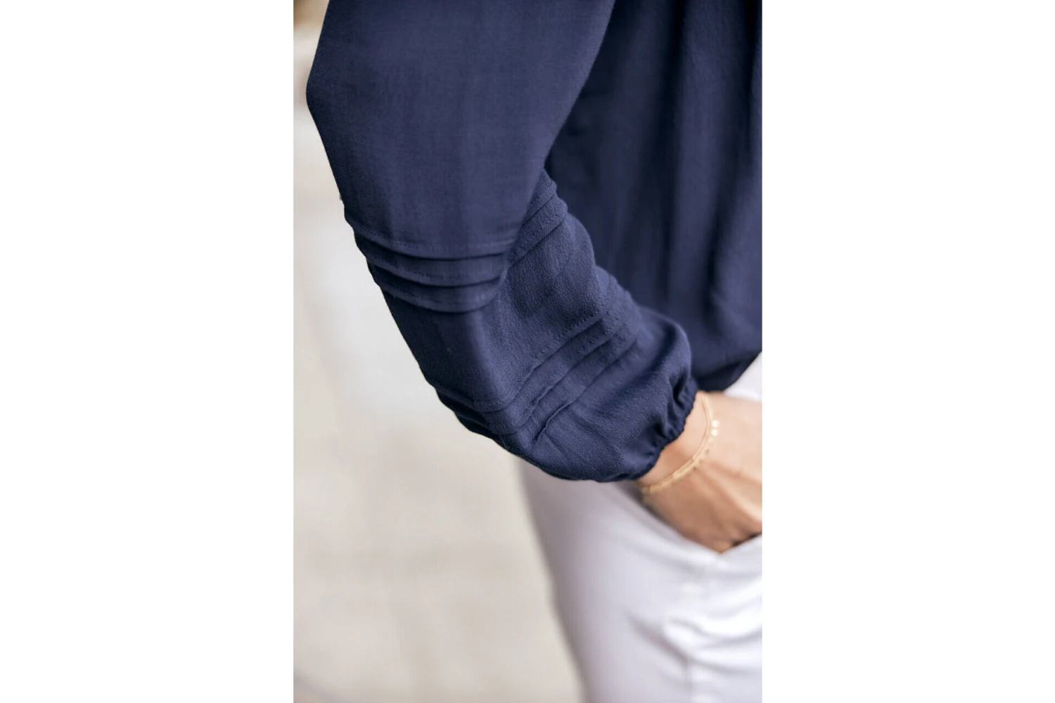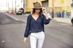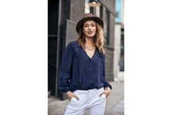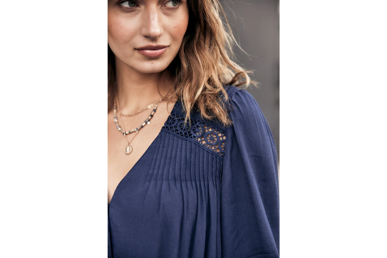 • Encolure en V et boutons recouverts sur tout le milieu devant
